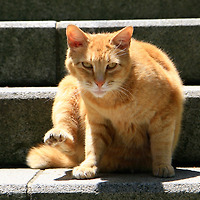 작은 절 마루위에 조용히 앉아 명상을 하고 있는 길 고양이