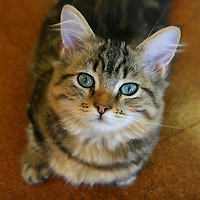 카메라가 신기한 듯 뚫어지게 바라보고 있는 얼룩 아기 고양이