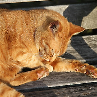 그루밍을 시작하는 2층 갈색 얼룩이 그르릉 그르릉