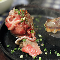 돌판에 구워 먹는 레어 소고기 햄버거 스테이크