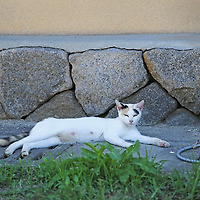 더위를 피하기 위해 상점 그늘에 누워 숙면을 취하고 있는 사나기지마 섬 고양이들