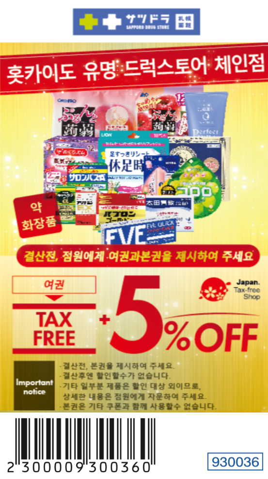 사츠도라는 일본의 다른 드럭스토어와 같이 여권을 제시하면 면세를 받을 수 있으며 위의 쿠폰을 제시하면 면세 10%에 추가로 5%의 할인을 받을 수 있습니다.