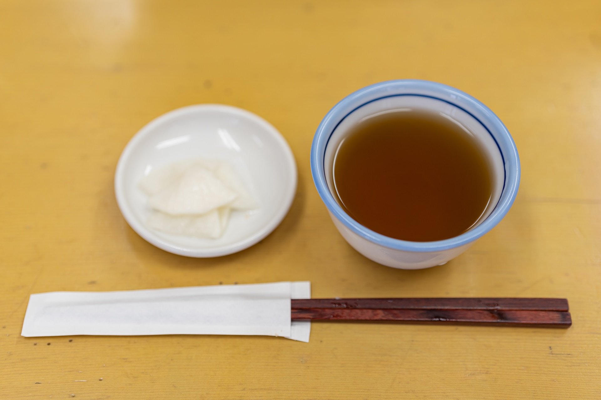 정식에는 따뜻한 녹차와 유자를 넣어 절인 무가 함께 나옵니다.