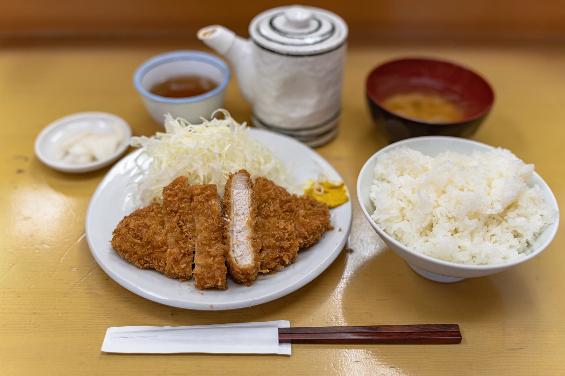 히레까스 제법 많은 양의 밥, 된장국, 절인 무, 따뜻한 차