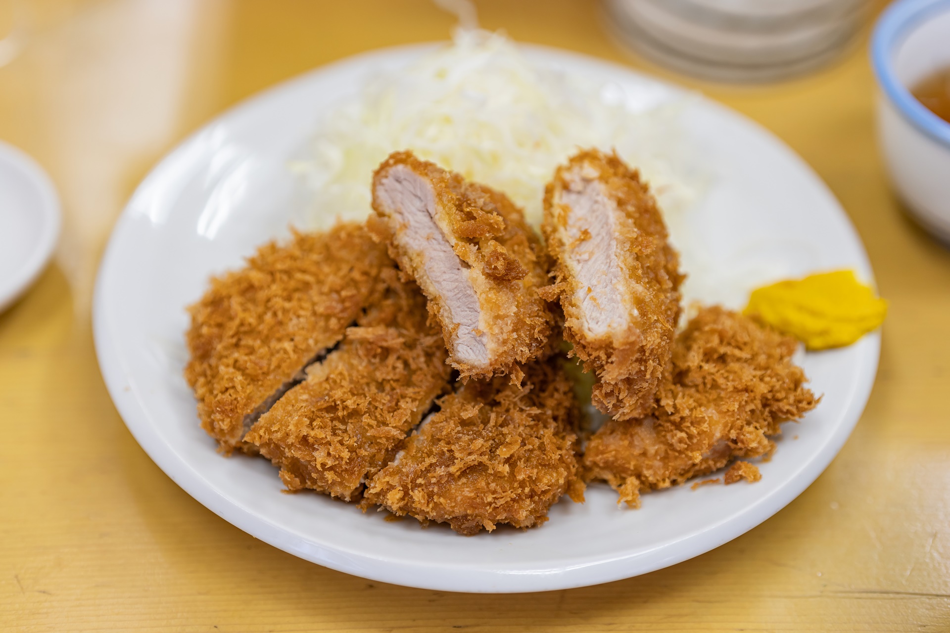 주문한 돈까스 완성, 수북히 쌓인 양배추와 함께 나왔습니다.