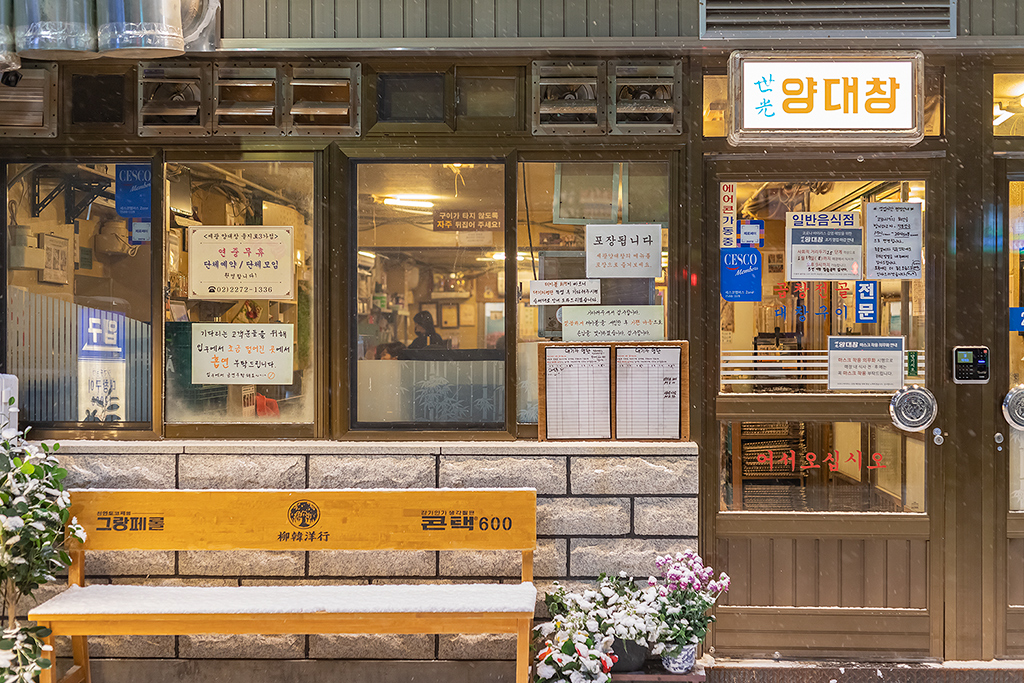 눈이 많이 내려 가까운 곱창 가게를 찾았습니다.