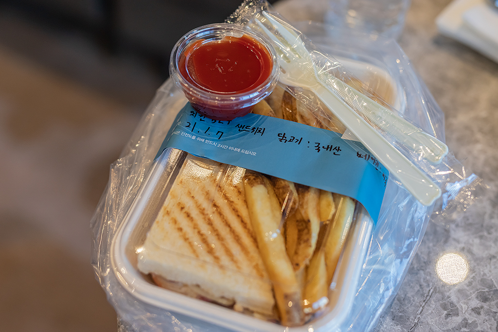 그래도 돈이 남아서 치킨 샌드위치를 포장으로