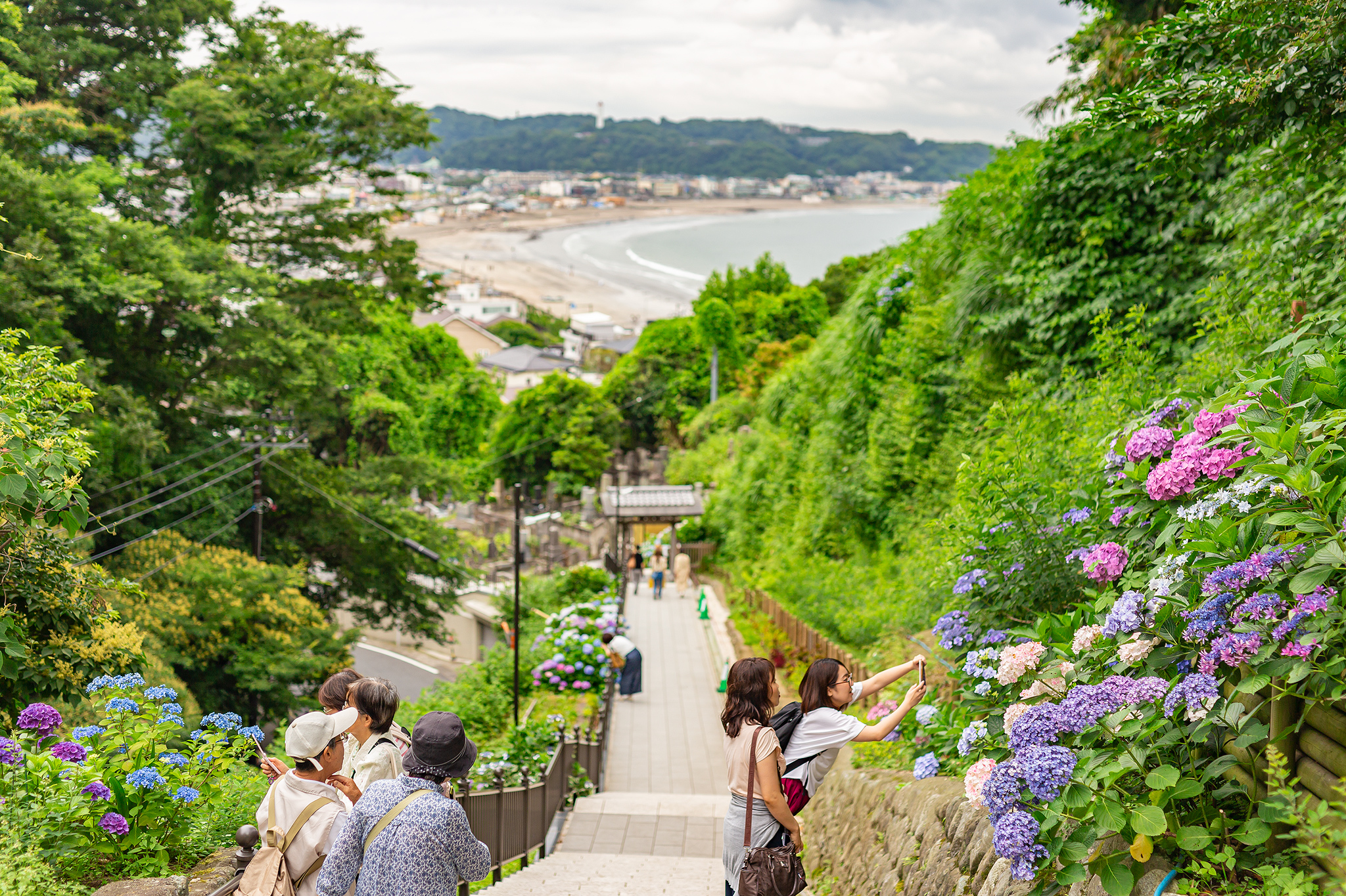 6월의 장마 기간에는 가마쿠라의 대부분의 지역에서 수국을 찾아볼 수 있습니다.