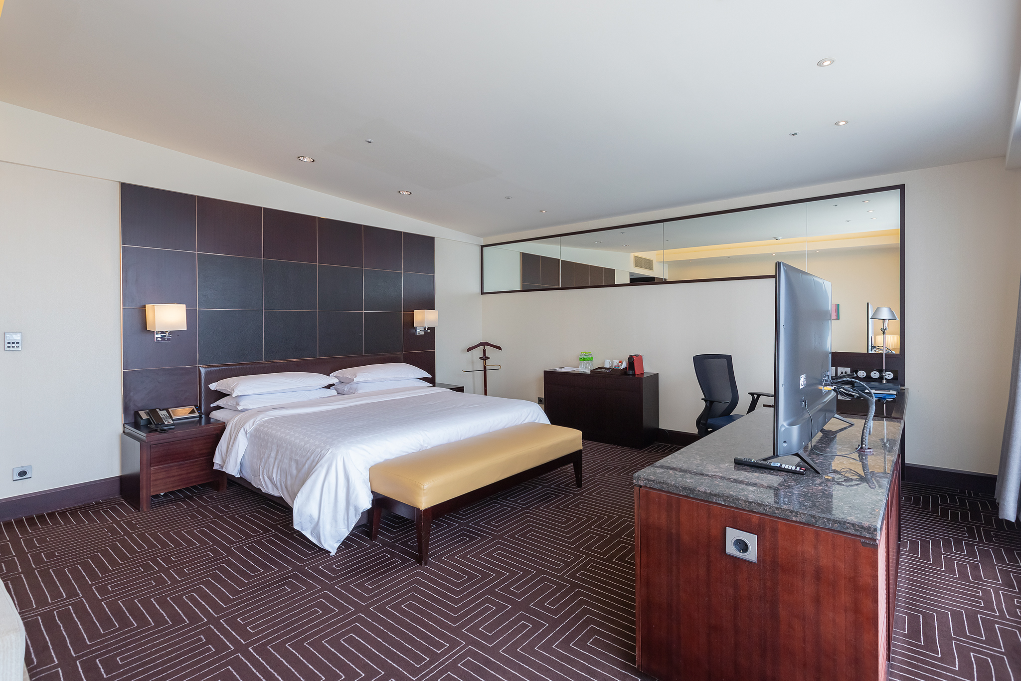 쉐라톤 그랜드 인천 호텔의 스위트 룸은 거실과 침실로 나뉘지 않고 하나의 큰 방으로 구성되어 있습니다.