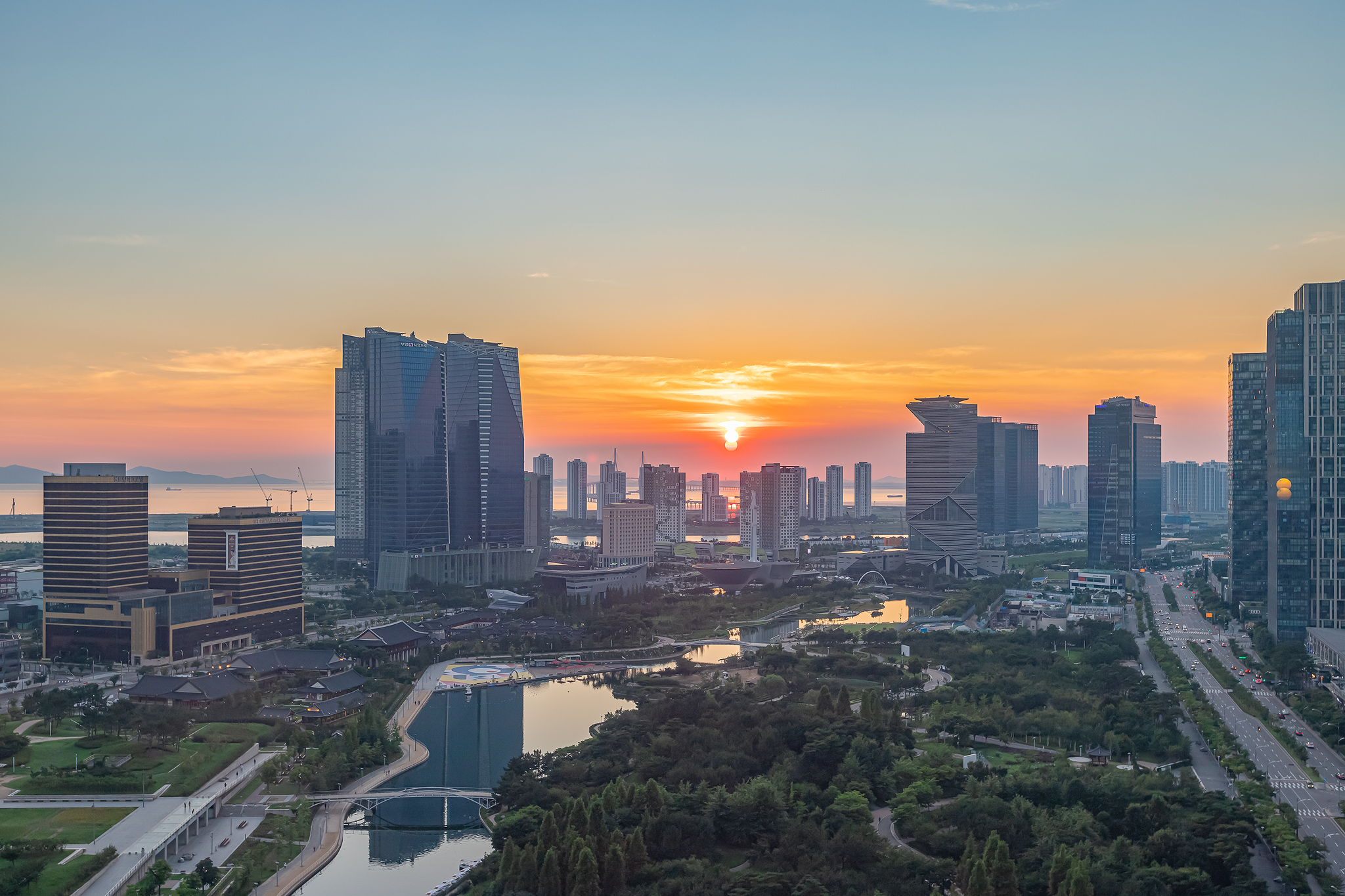 공원과 바다가 함께하는 송도의 저녁 풍경