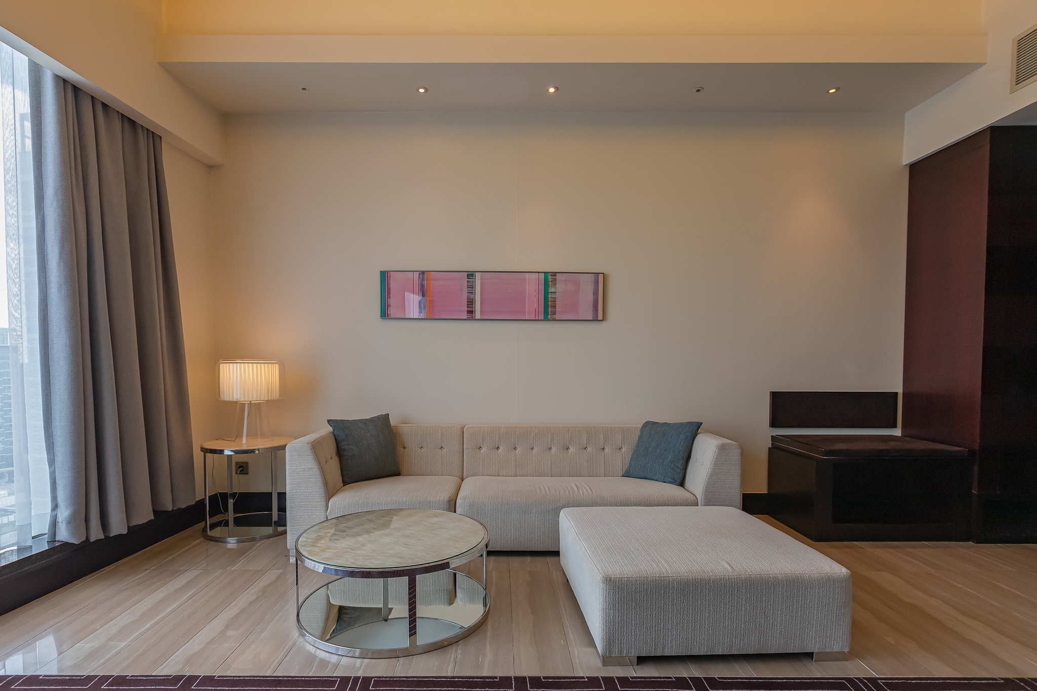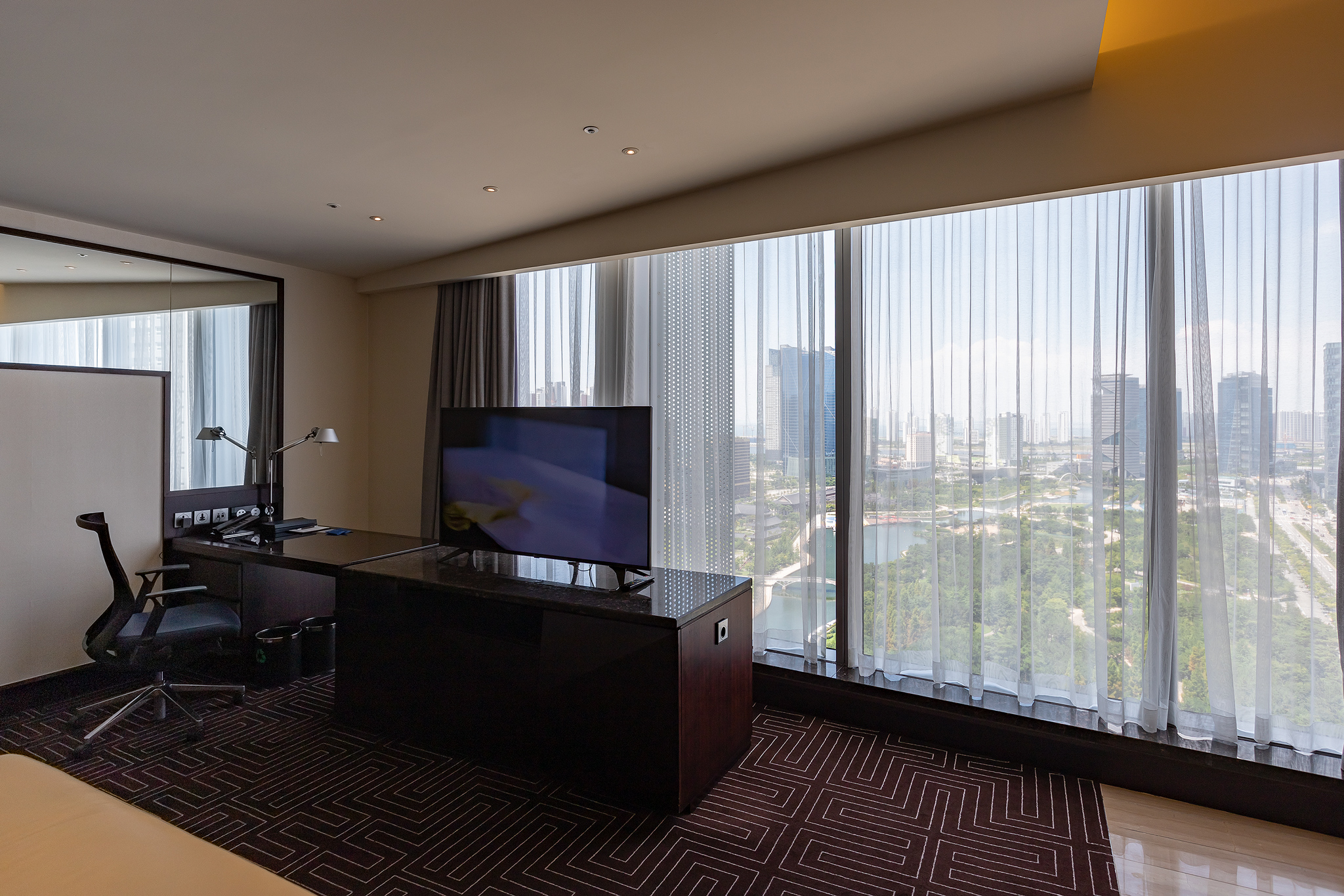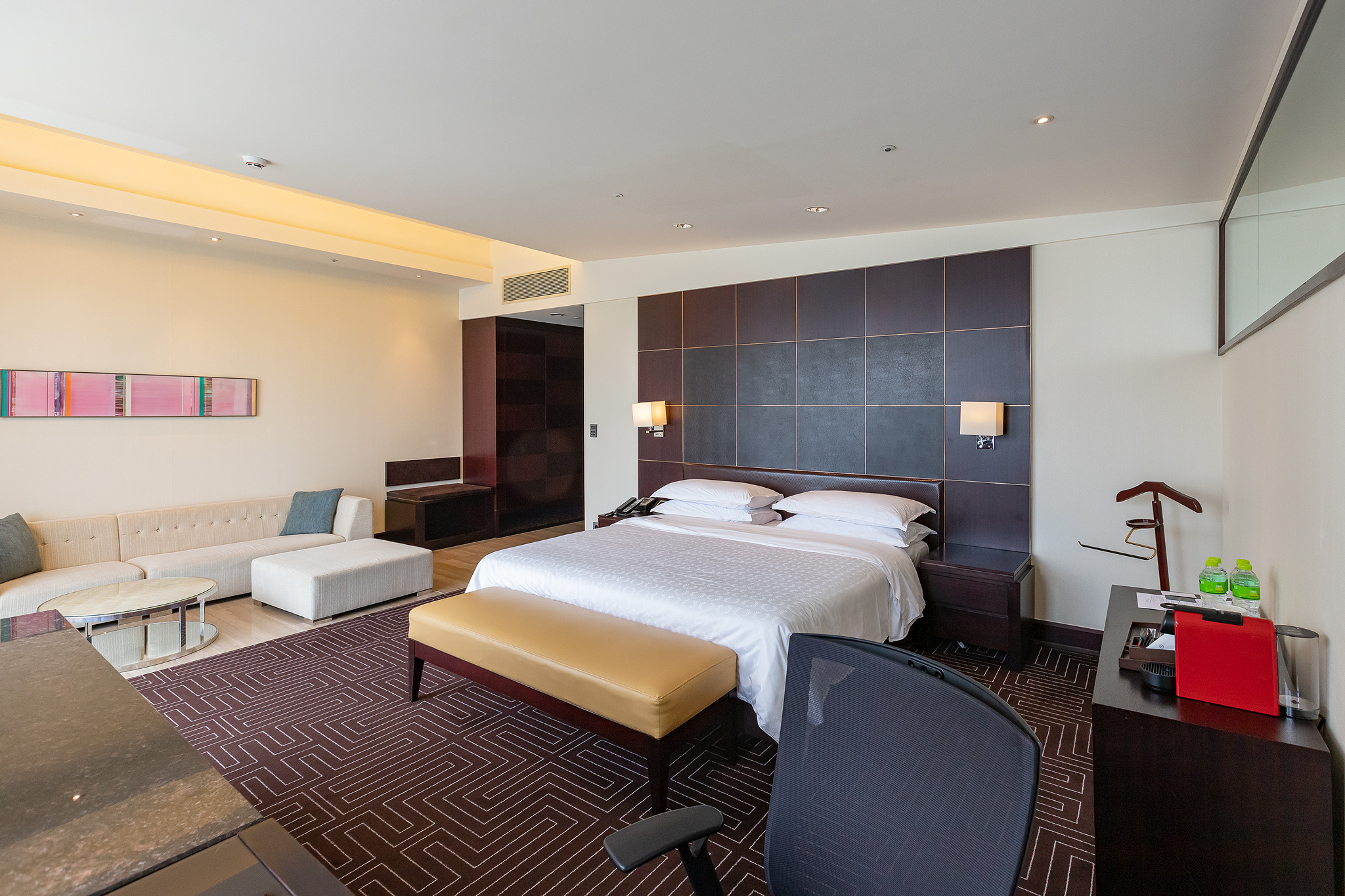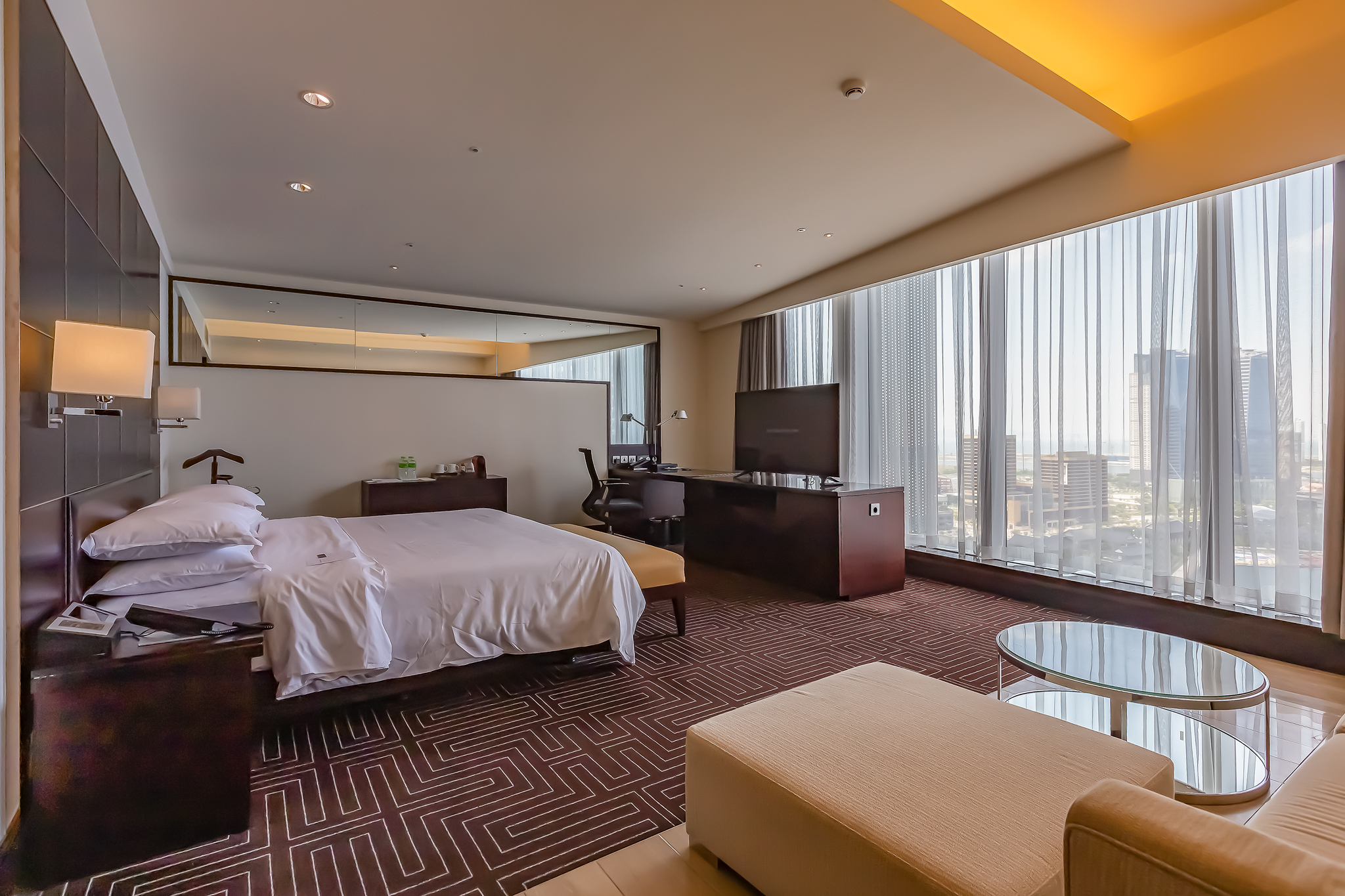 쉐라톤 그랜드 인천 호텔의 스위트 룸은 거실과 침실로 나뉘지 않고 하나의 큰 방으로 구성되어 있습니다.