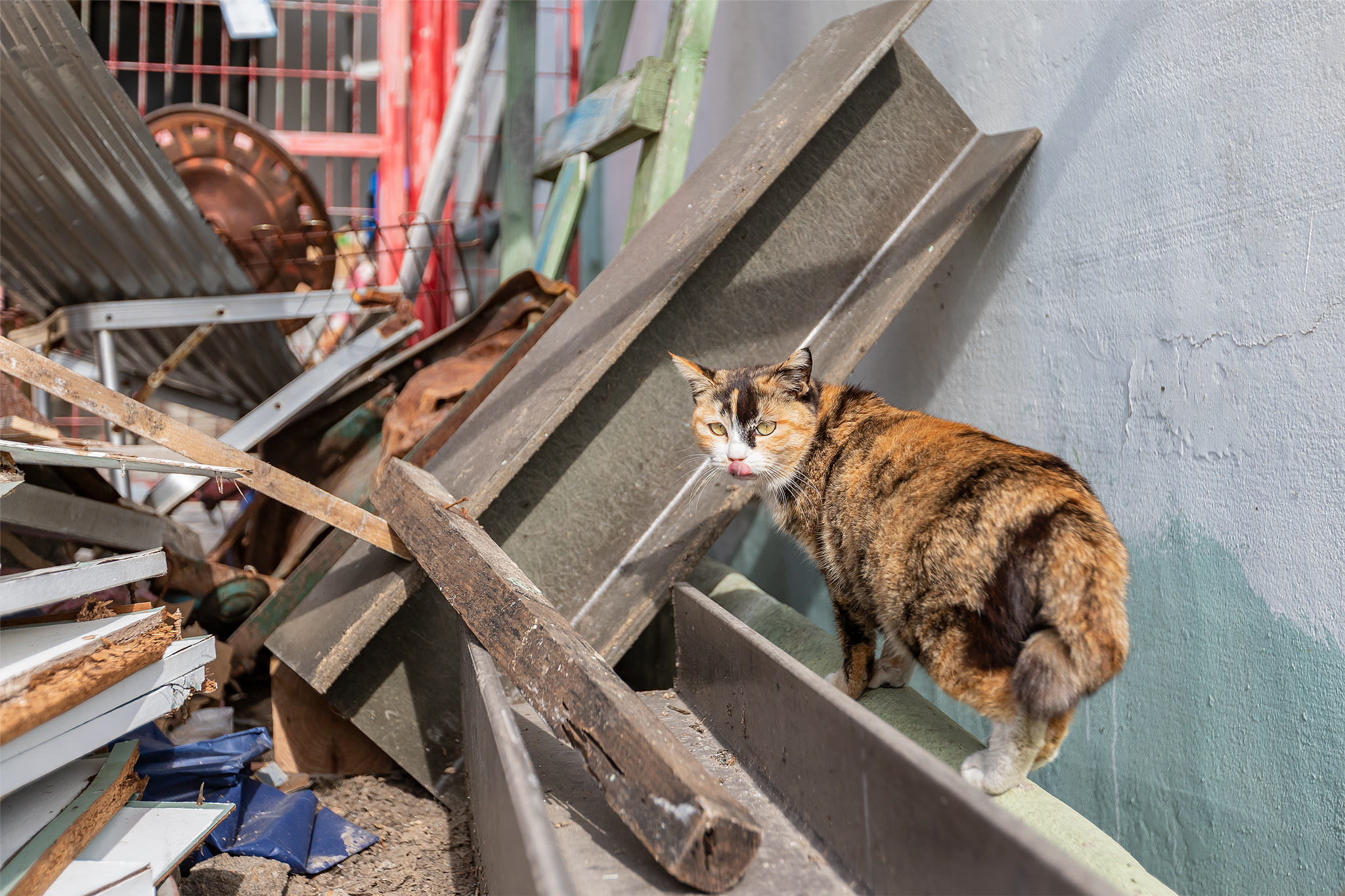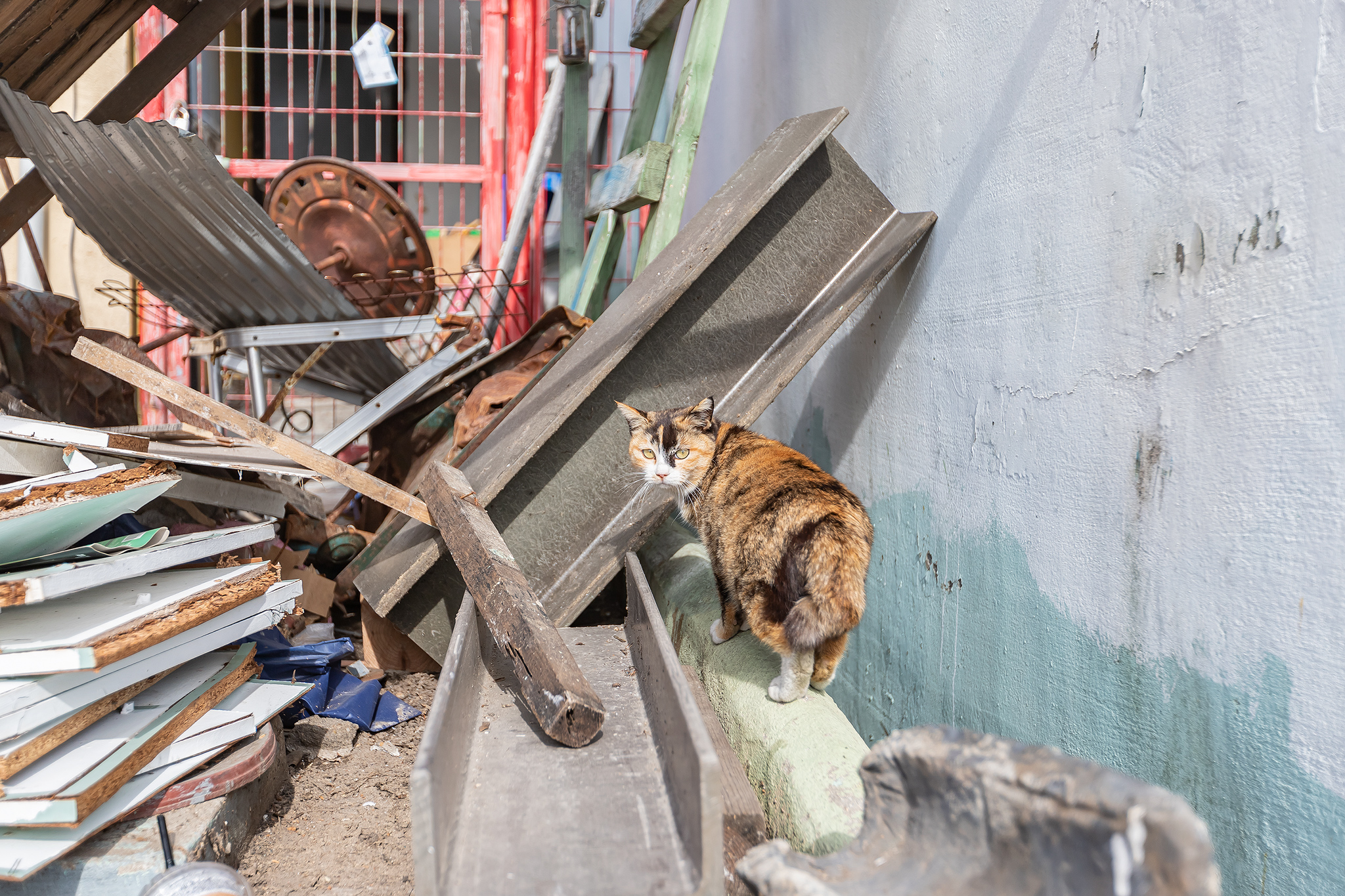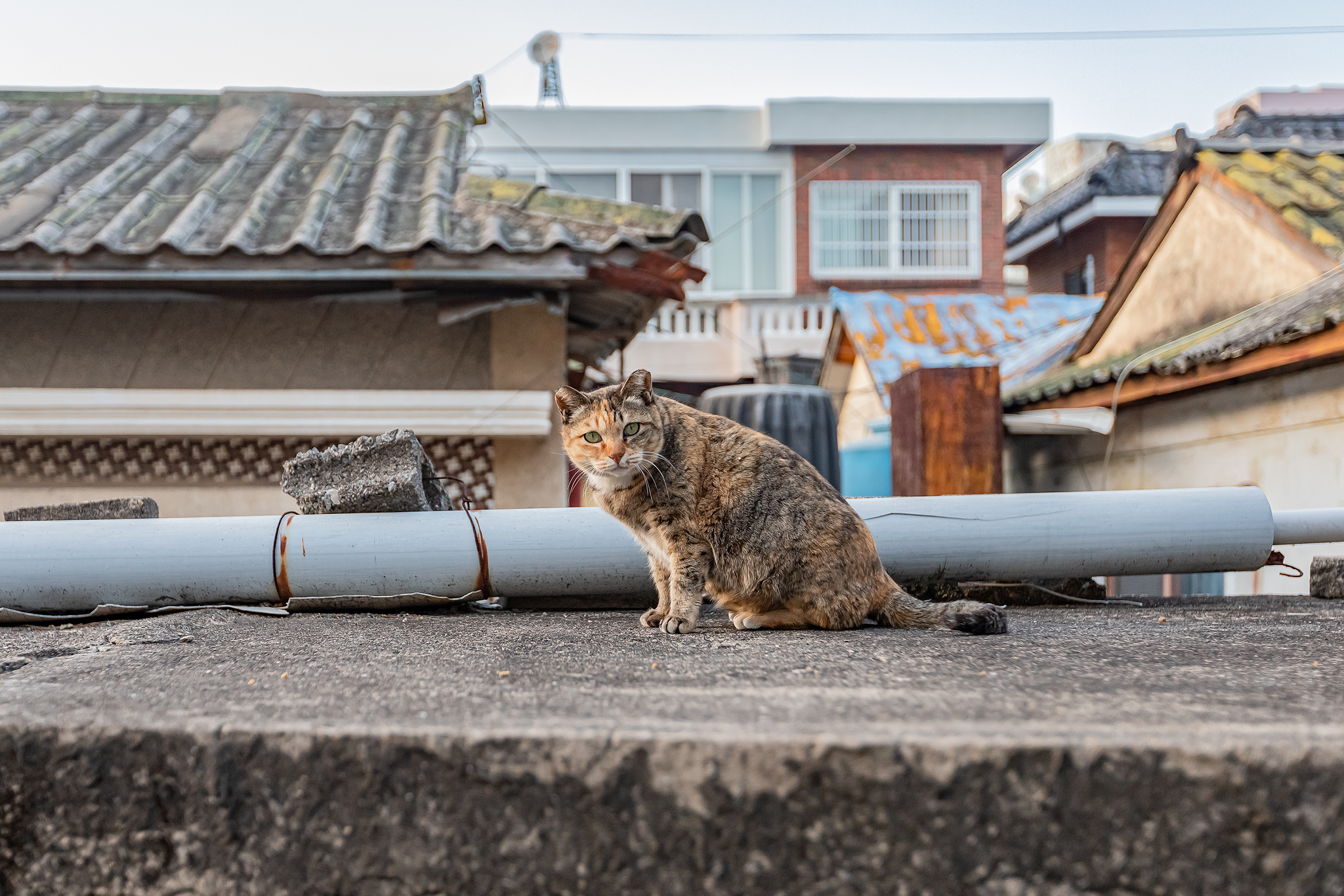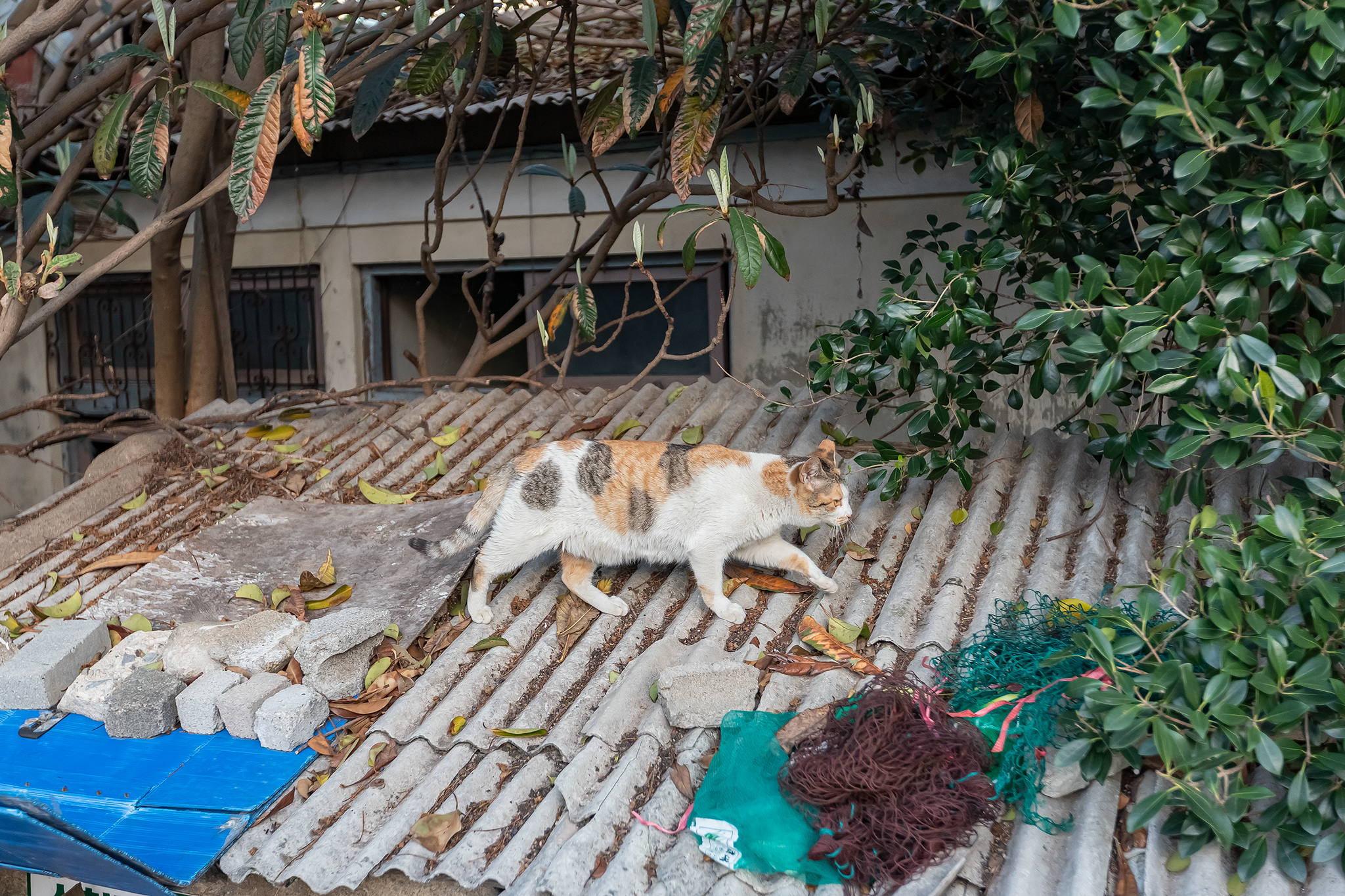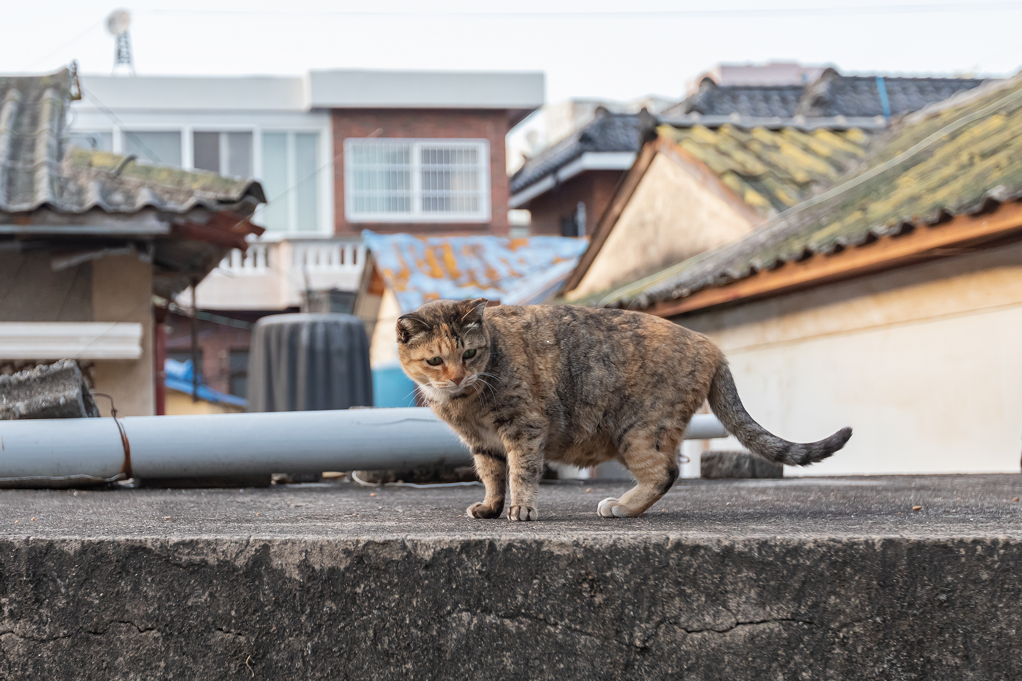 지붕위를 걷는 삼색 고양이