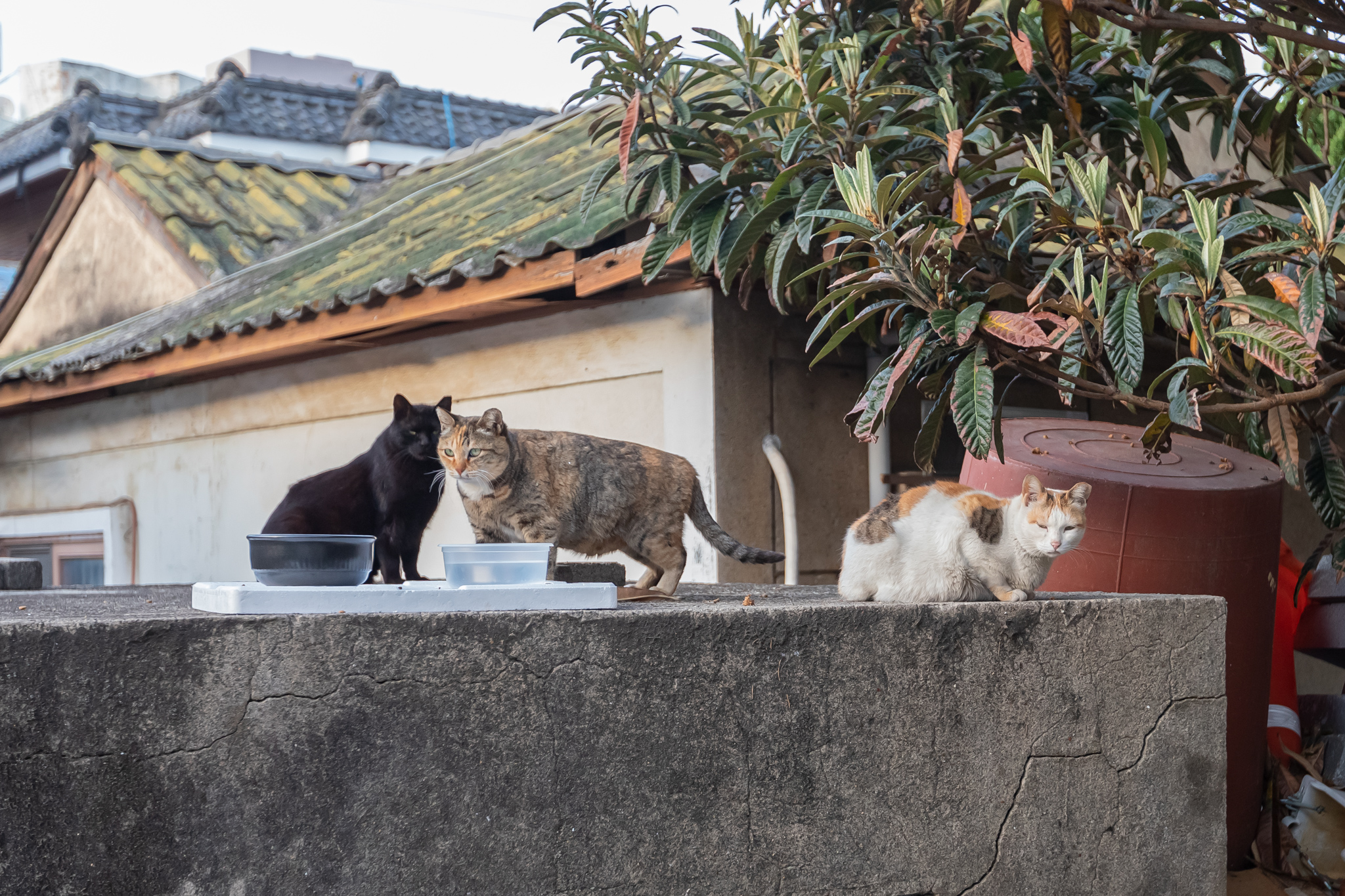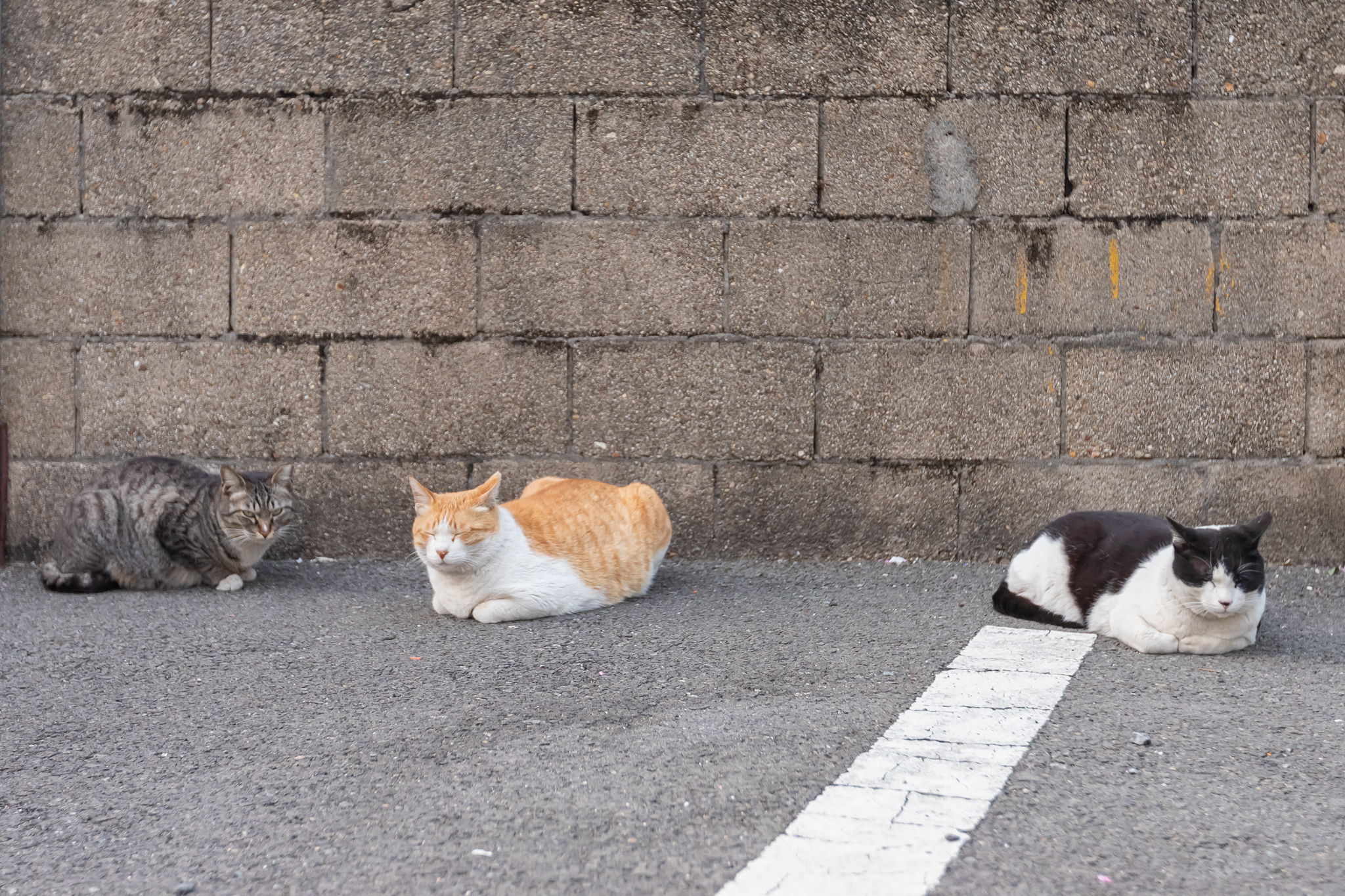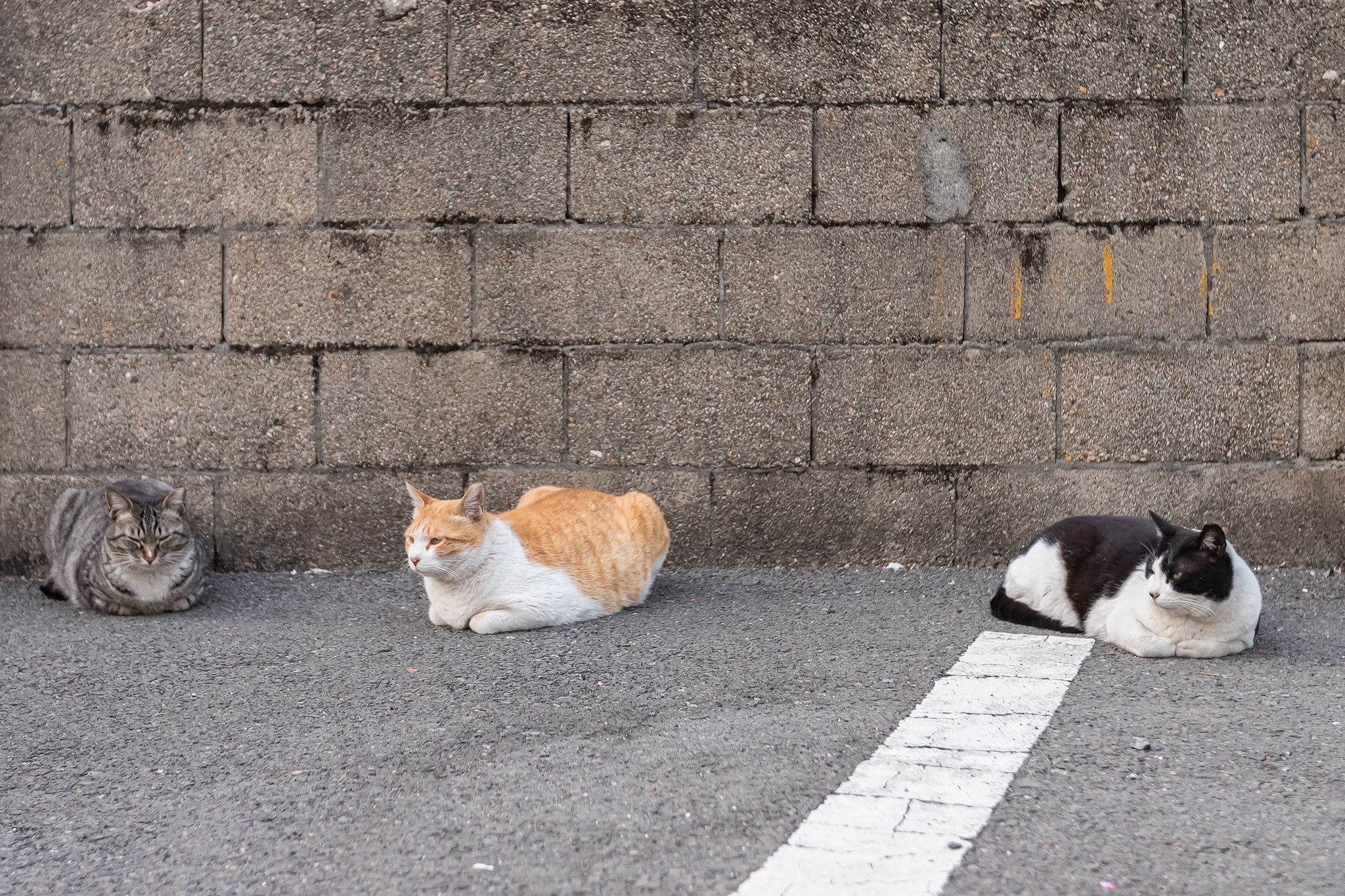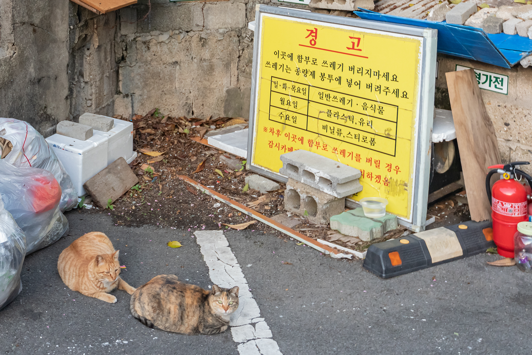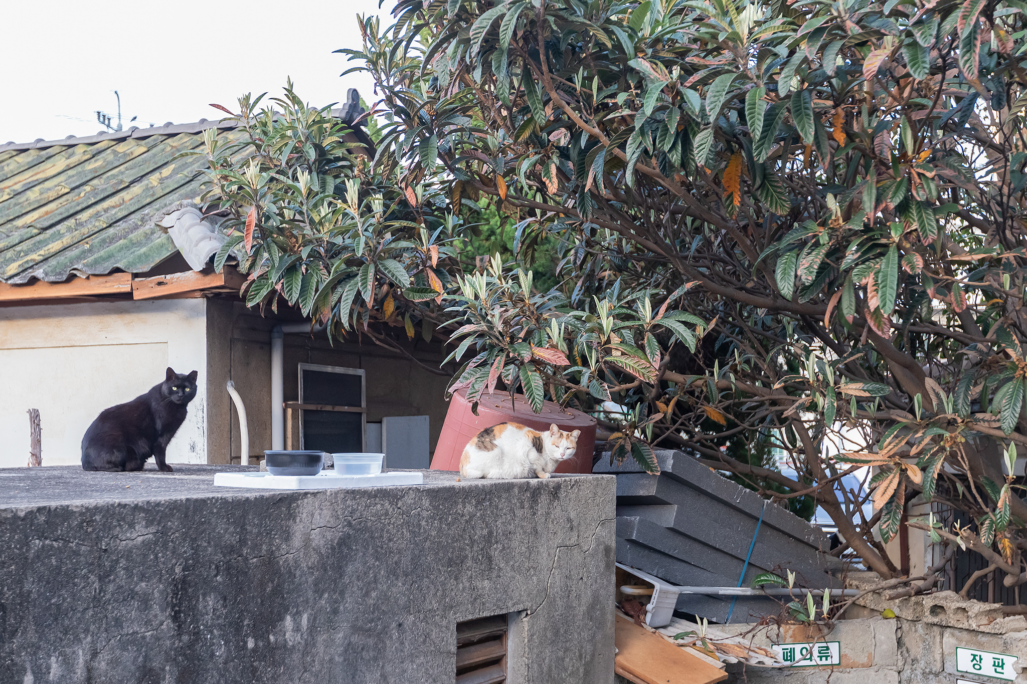 주차장 뒤에는 많은 고양이들이 모여 있었습니다.
