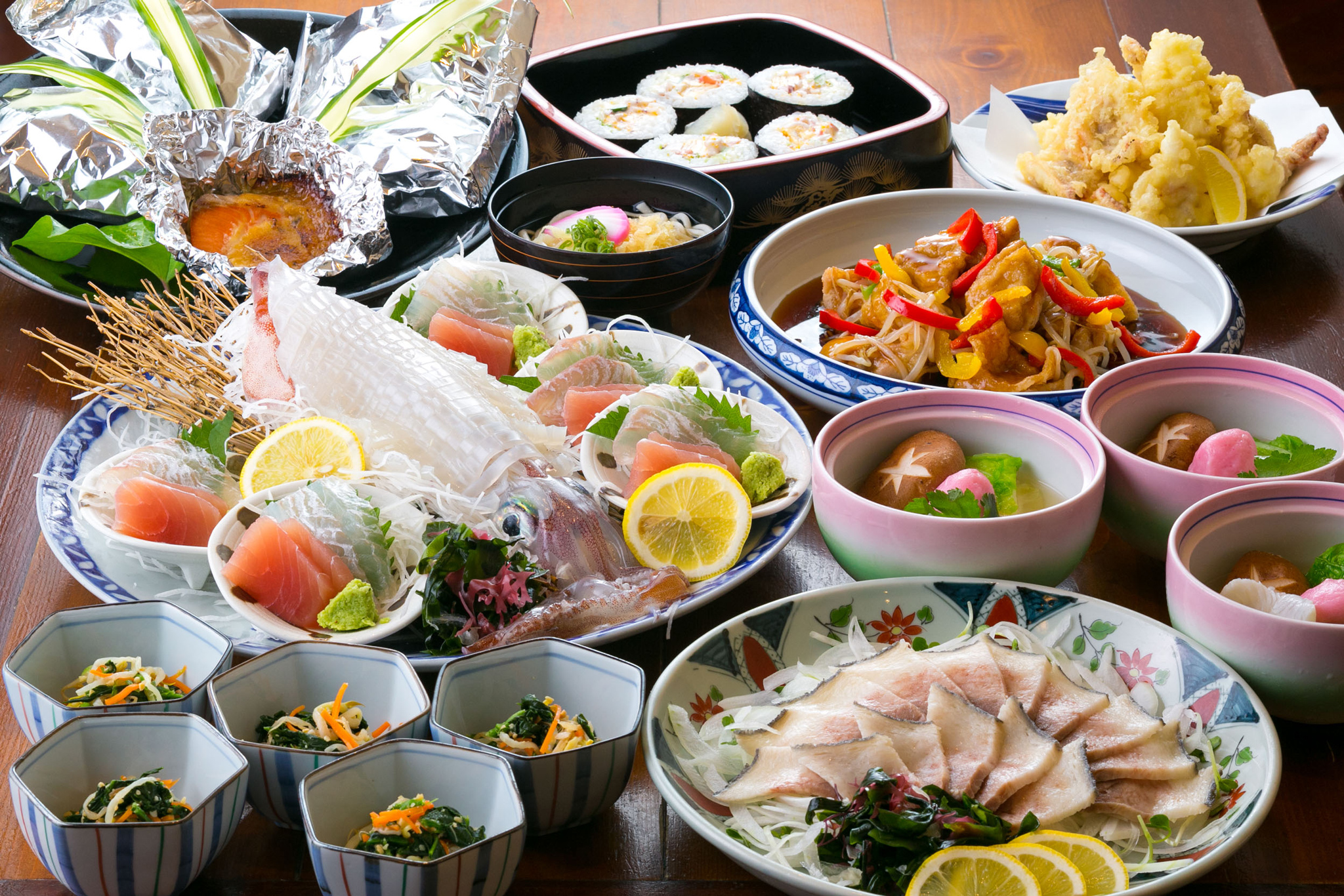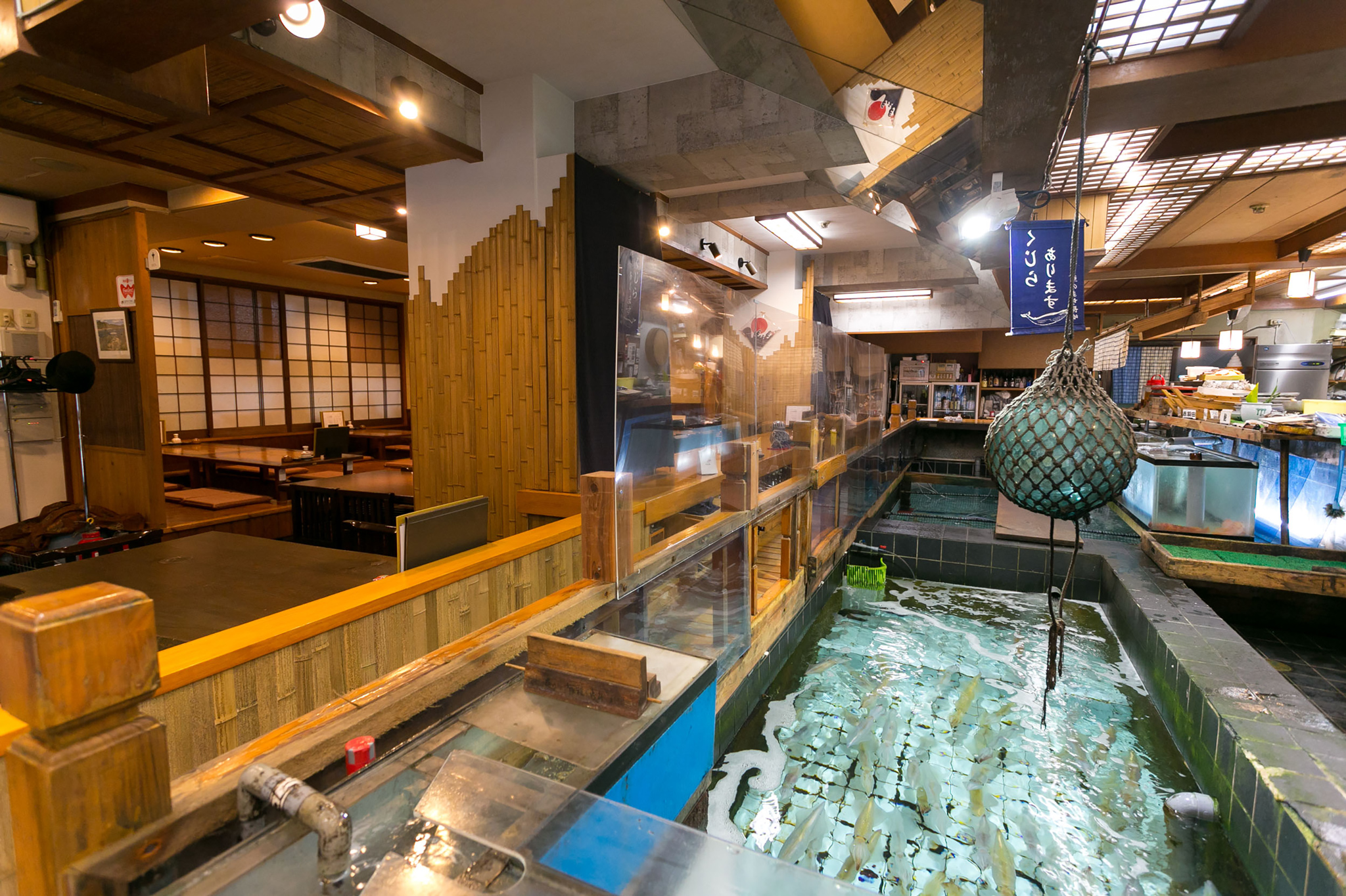 나가사키의 해산물을 신선한 상태 그대로, 잘 관리된 커다란 활어조에서 다양한 해산물을 관찰하며 맛볼 수 있습니다. 오징어는 어항에서 직송한 신선도 그대로 맛볼 수 있으며 나가사키 향토 생선도 활어회로 즐길 수 있습니다.