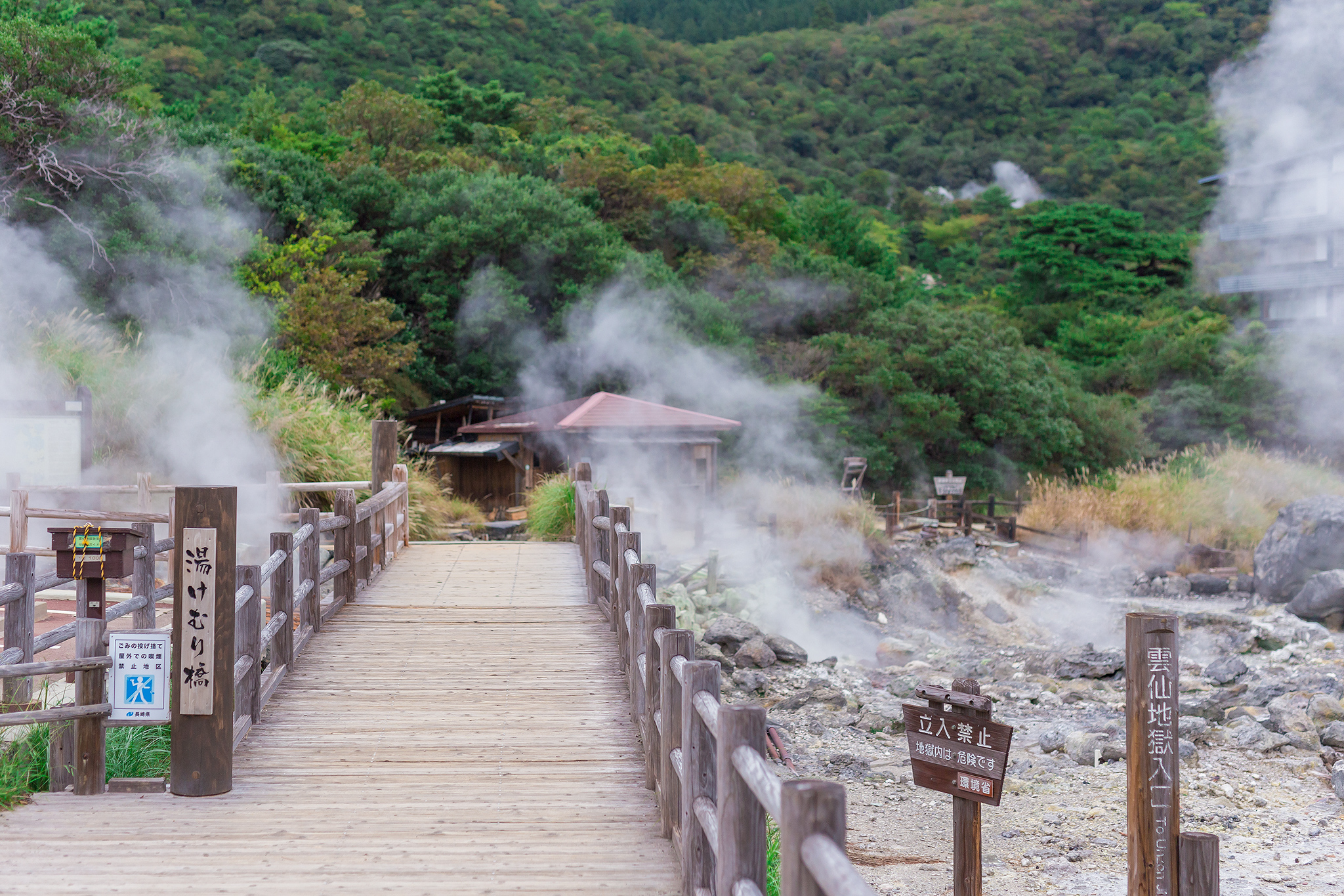 운젠 산을 중심으로 나가사키에서 구마모토 방향으로 돌출되어 있는 시마바라 반도에는 나가사키 근교에서 가장 유명한 온천 휴양지인 운젠과 구마모토에서 페리로 30분 거리에 있는 시마바라가 있습니다. 시마바라 성에 오르면 운젠 화산의 멋진 풍경과 바닷마을의 소소한 풍경을 감상할 수 있습니다. 온천 증기까 뿜어저 나오는 운젠은 가을 단풍 명소이기도 합니다.