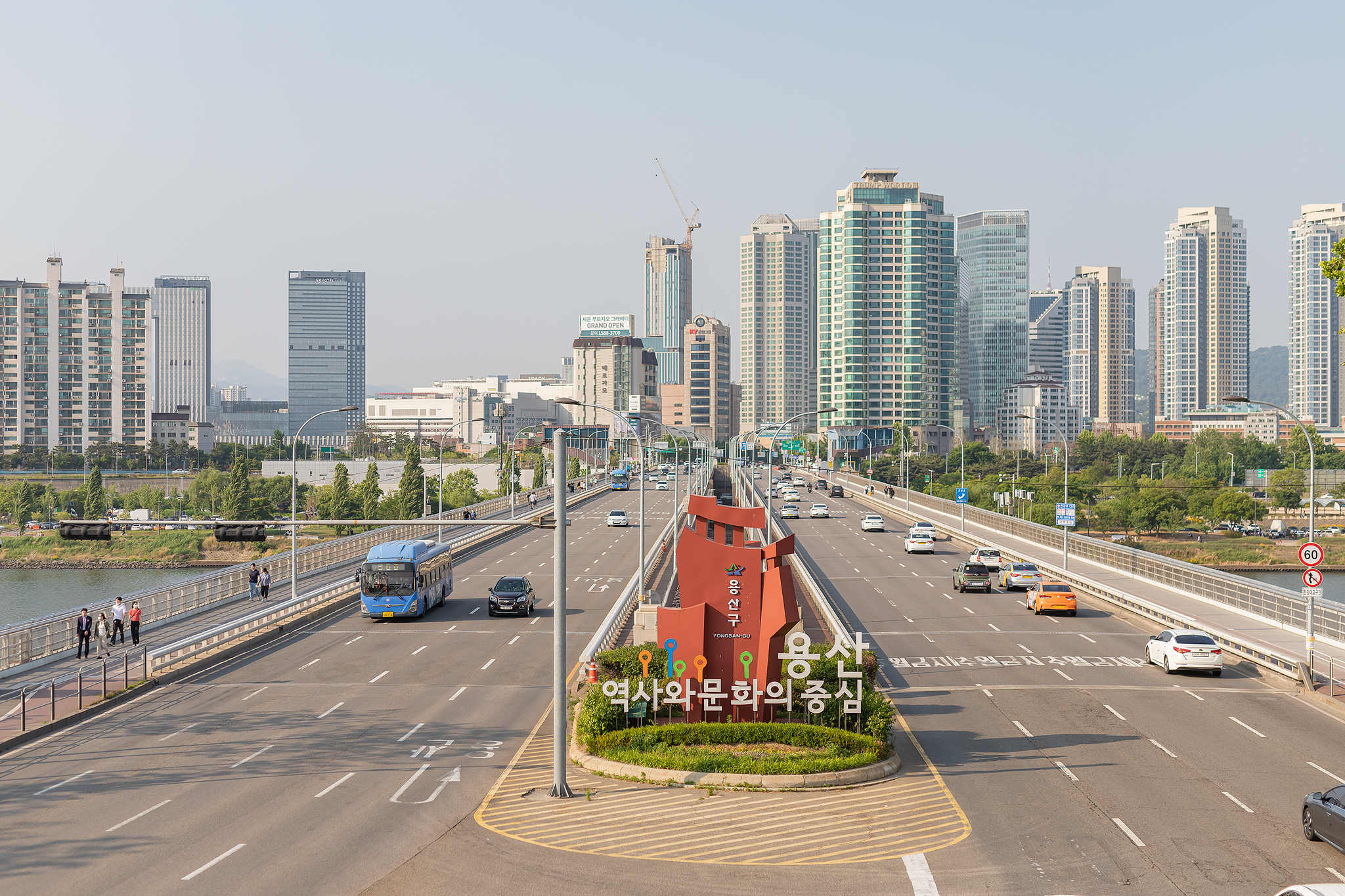 육교를 건너며 한강대로와 용산의 풍경을 살펴볼 수 있습니다.