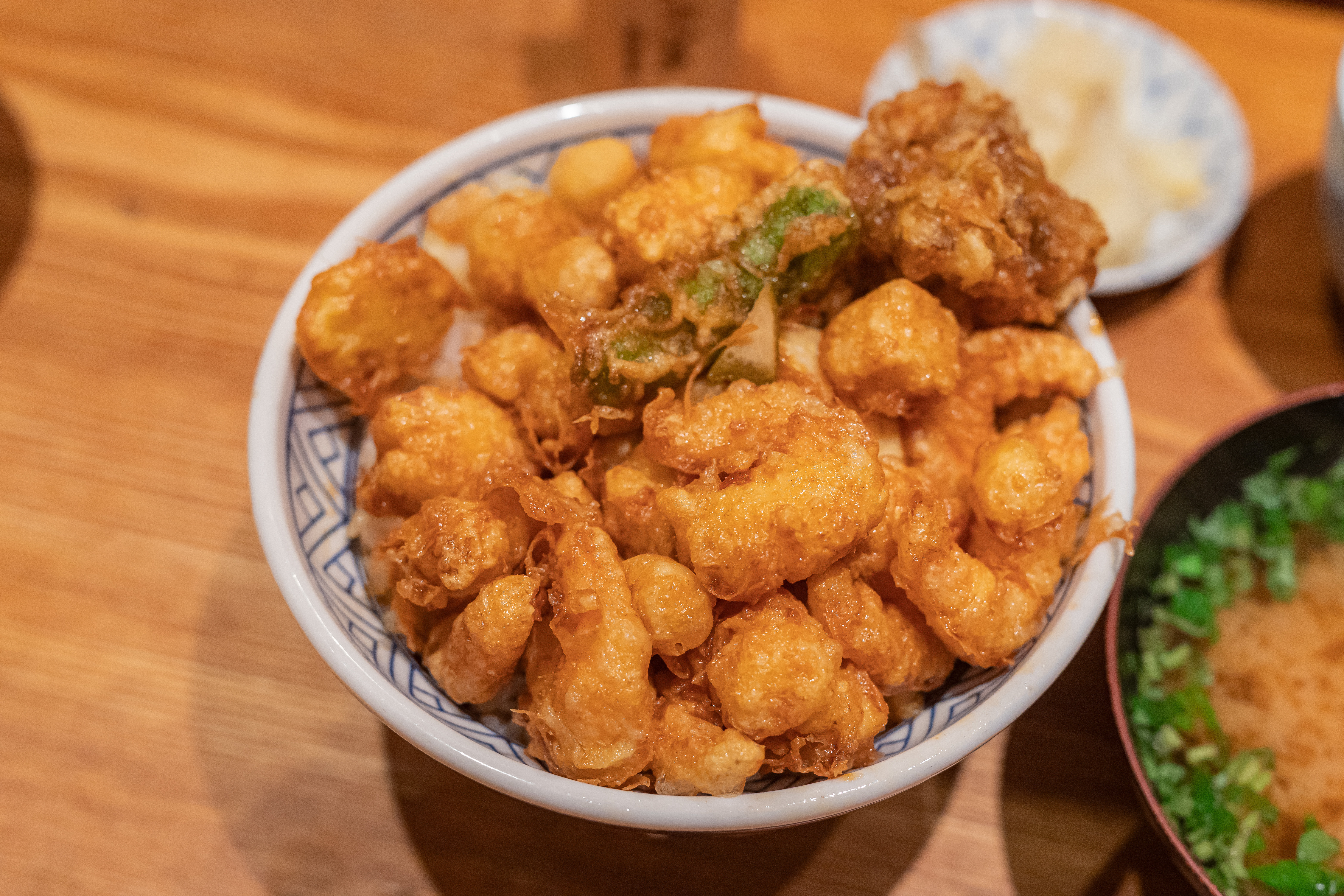 튀김이 가득이라 밥이 보이지 않는 가네코야의 튀김 덮밥