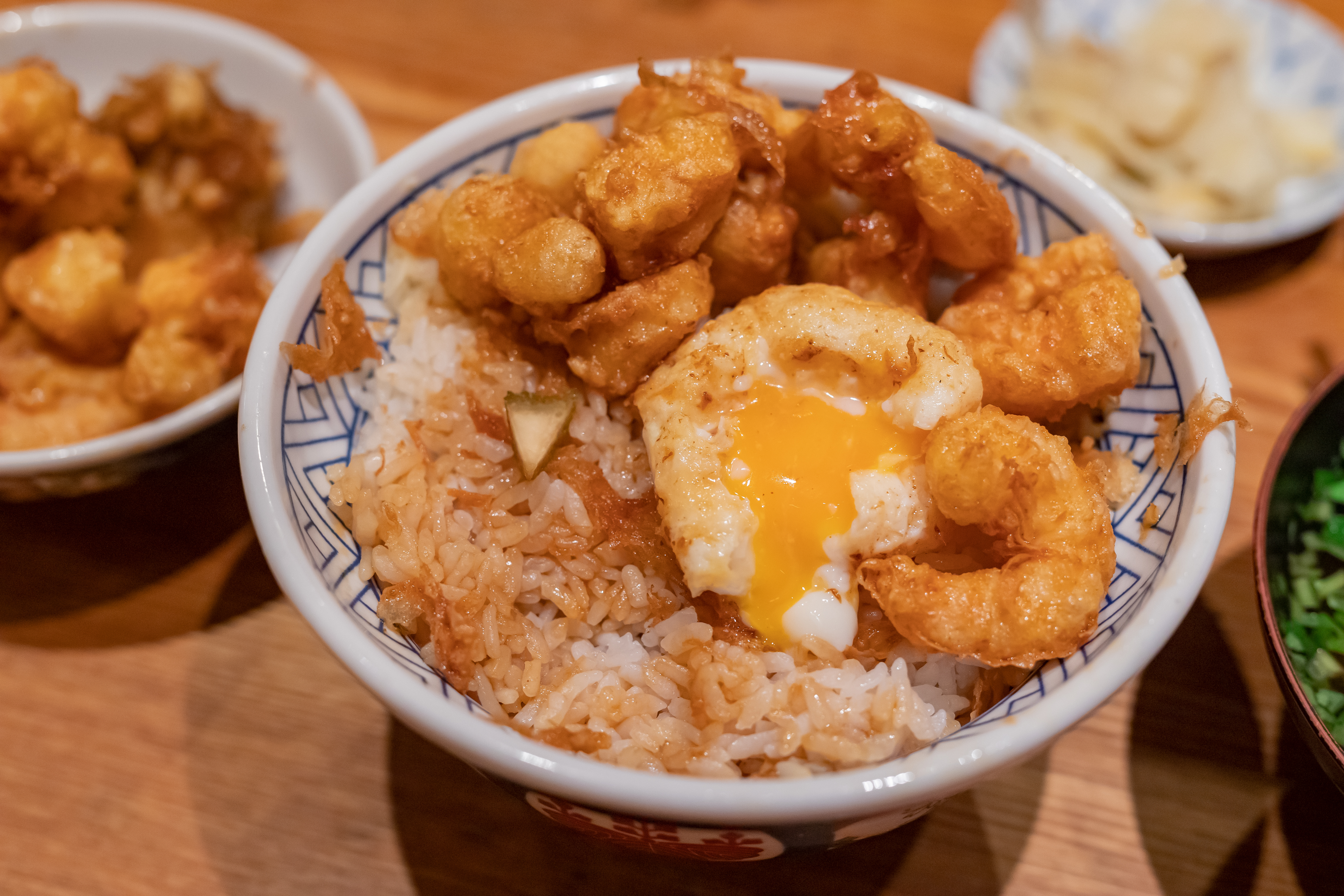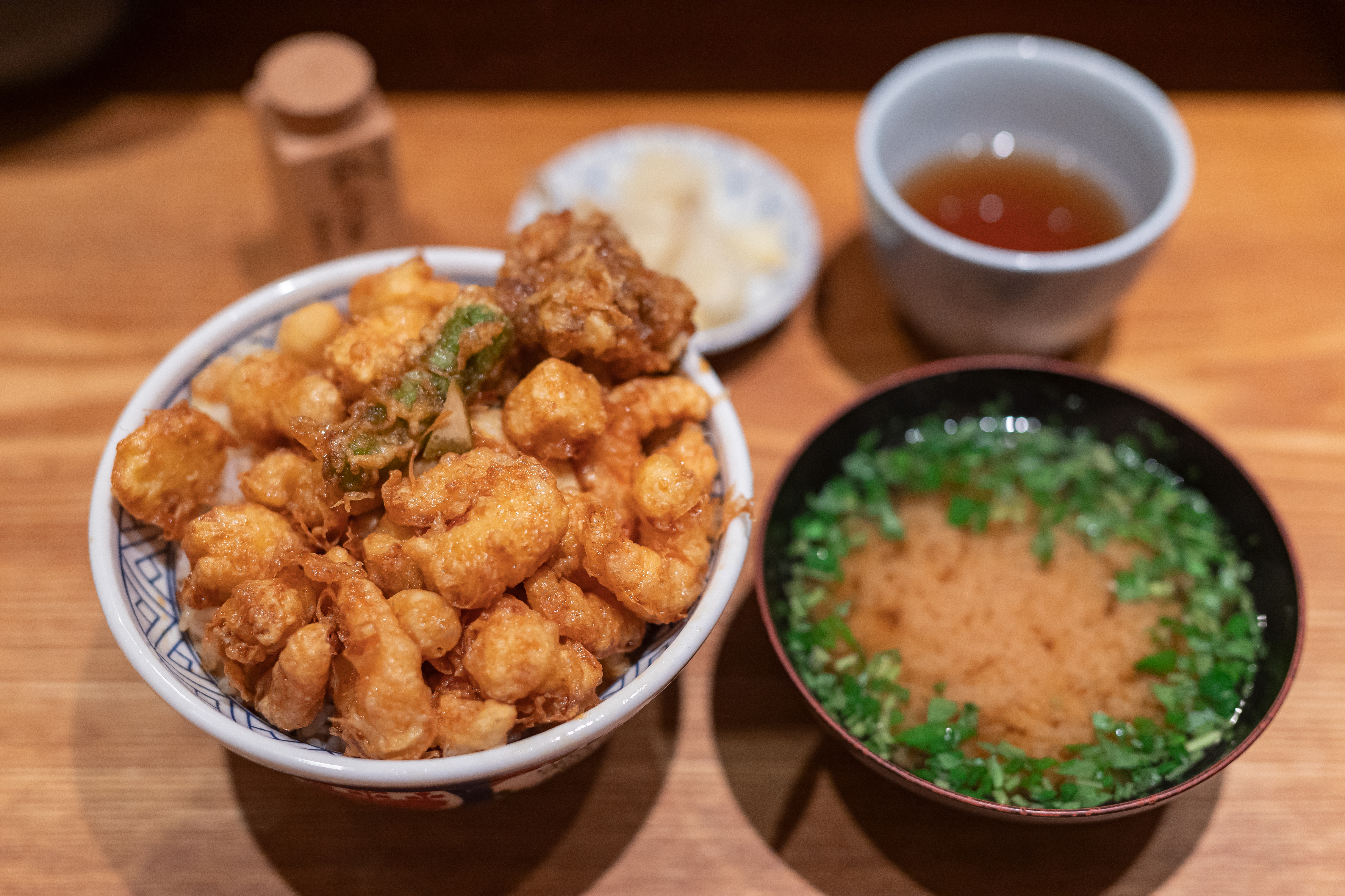튀김이 가득이라 밥이 보이지 않는 가네코야의 튀김 덮밥