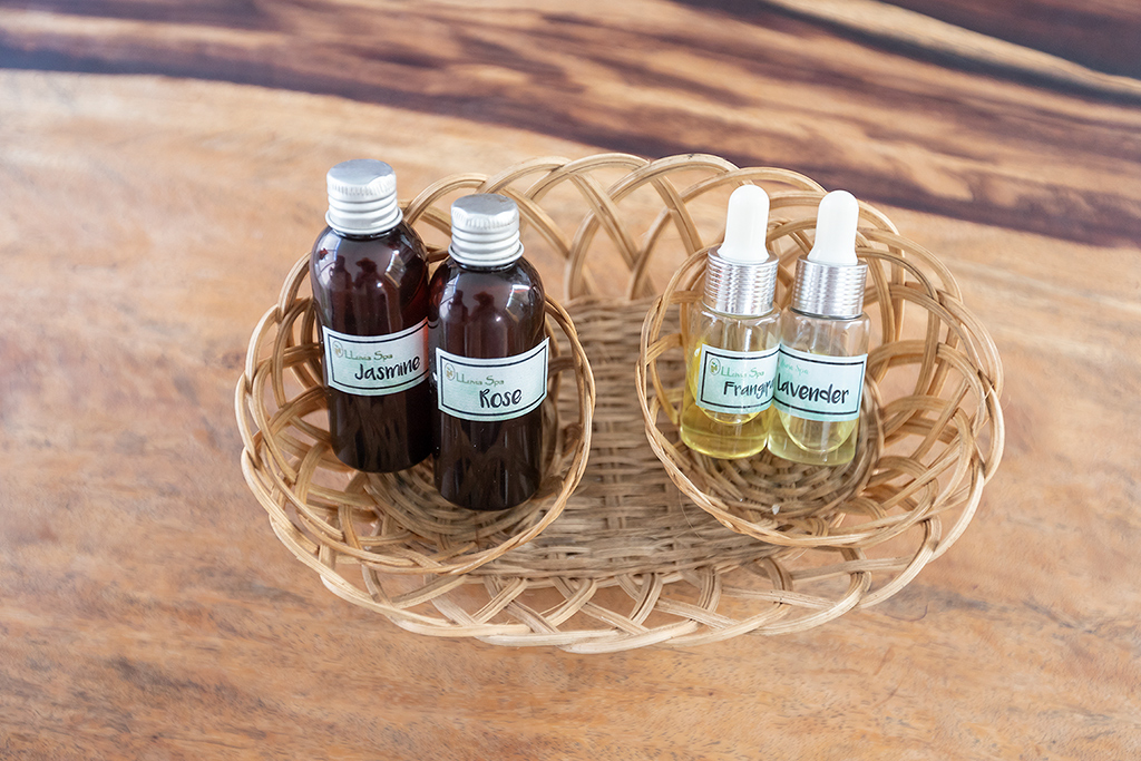 웰컴 드링크를 마시고 아로마 마사지에 사용할 4가지 향기 오일 중 하나를 고릅니다.