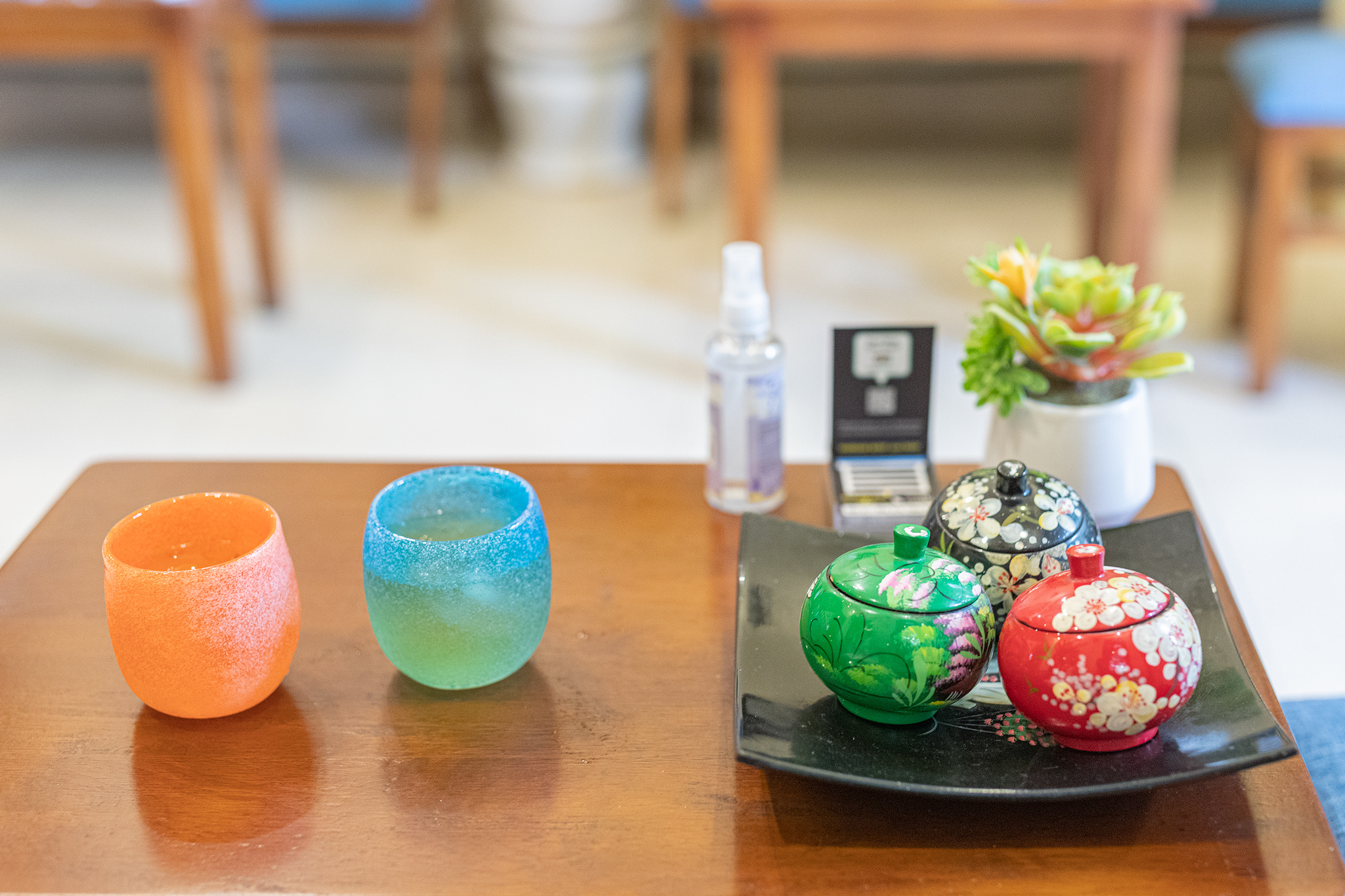 시원한 차가 제공되며 3가지의 아로마 오일 중 하나를 고를 수 있습니다.