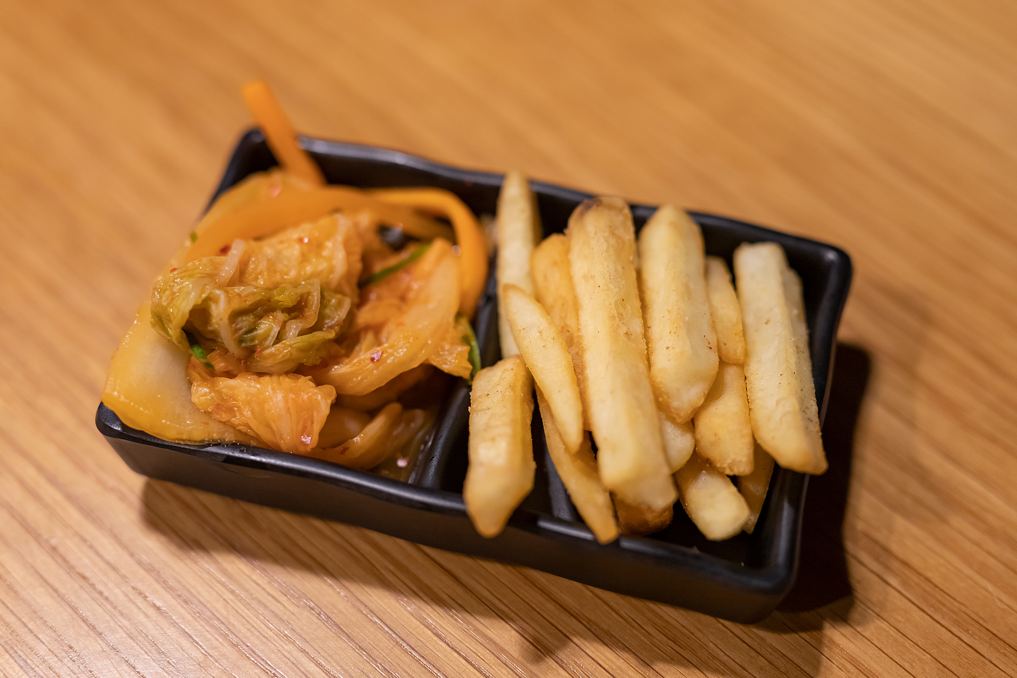 기본 반찬으로 김치와 감자 튀김이 놓입니다.