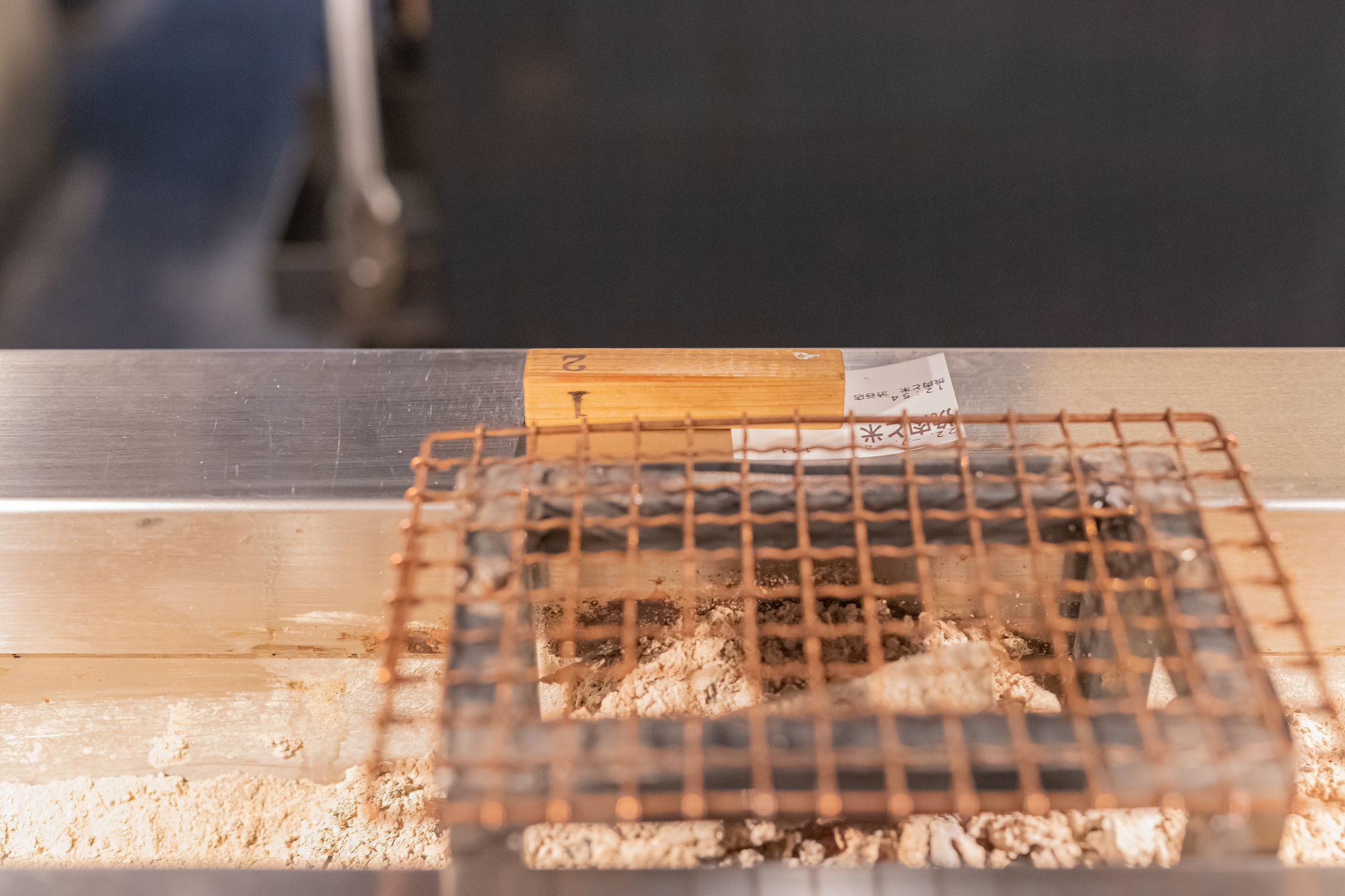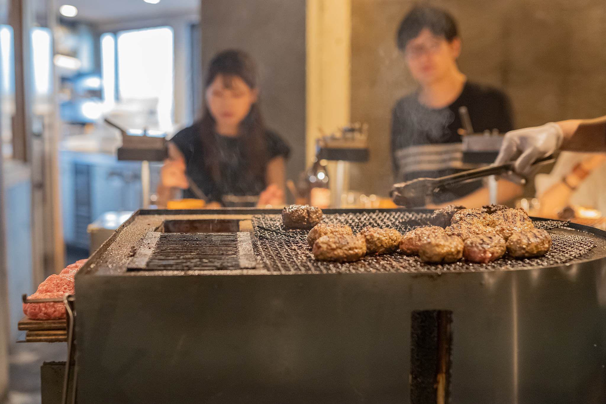 고기가 다 익으면 하나씩 자리 앞의 철그물판에 햄버그를 올려놓습니다.