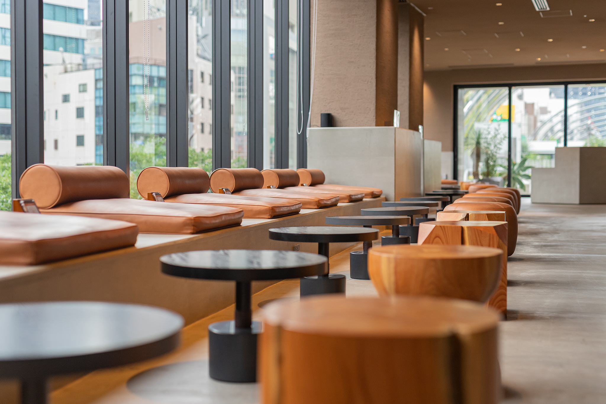 로비의 카페는 편히 기대어 쉴 수 있는 공간과 작업을 하기 좋은 워크스테이션 공간으로 나뉩니다.