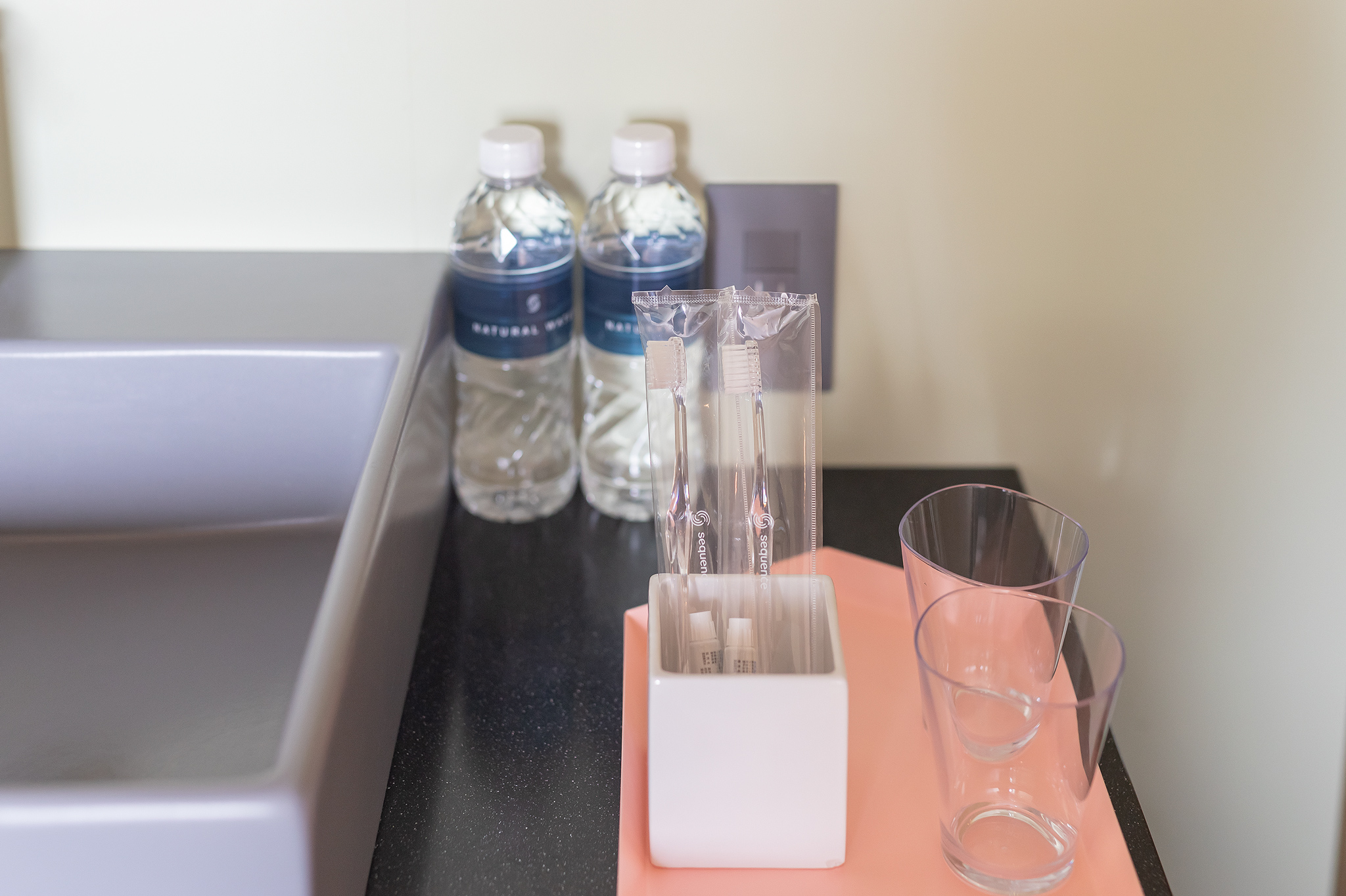 세면대 위에는 생수 2병과 칫솔