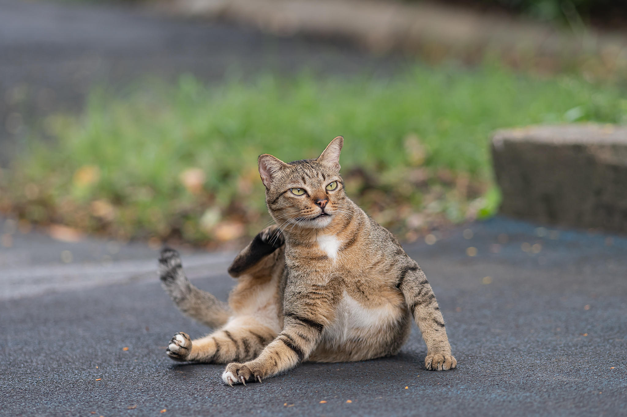 아스팔트 산책로에 누워있는 삼색 고양이