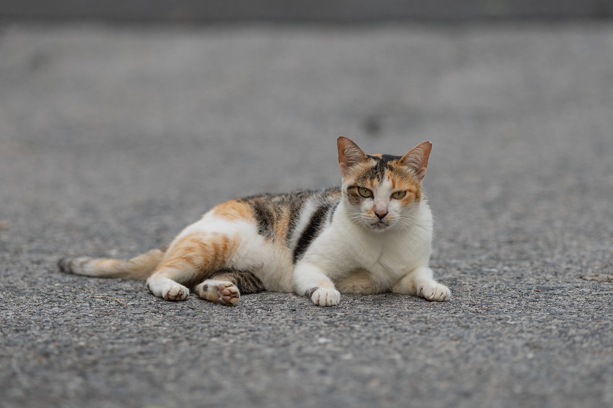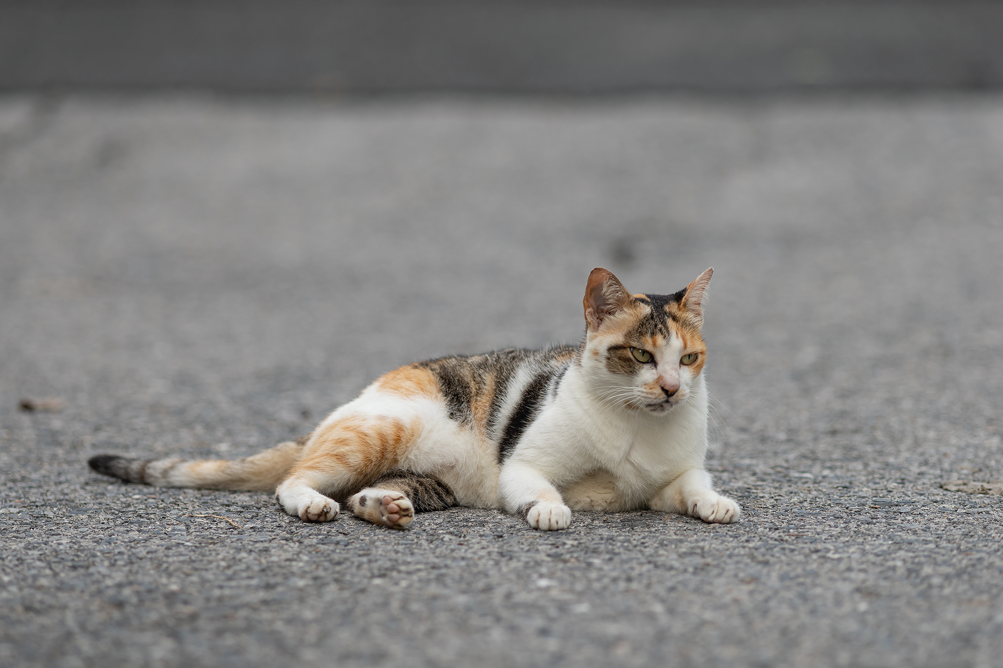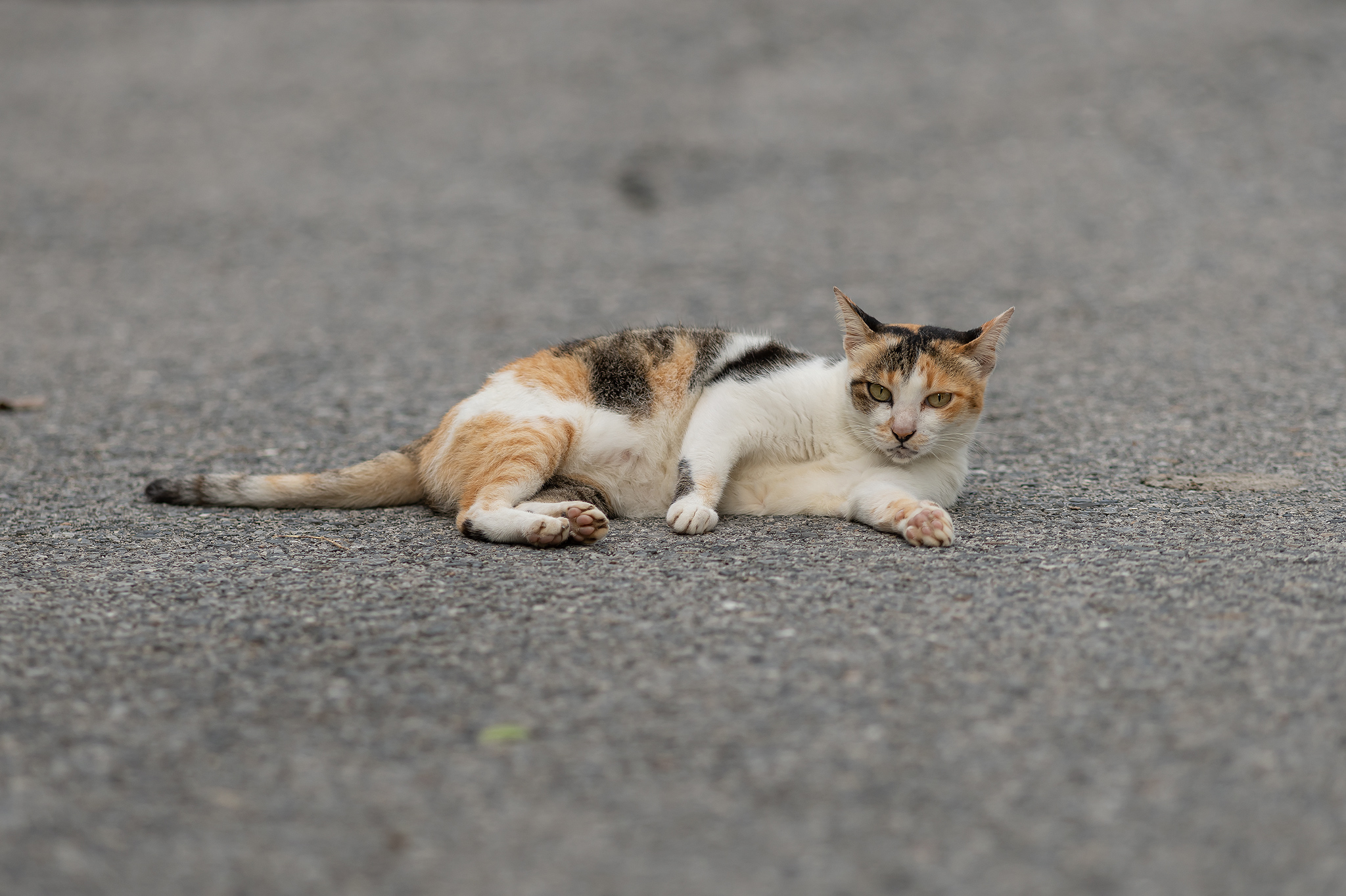 아스팔트 산책로에 누워있는 삼색 고양이