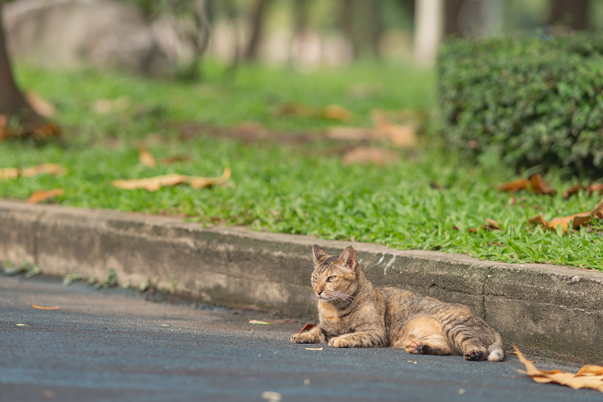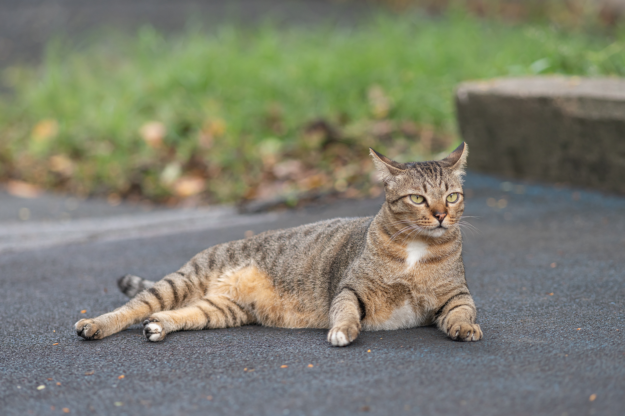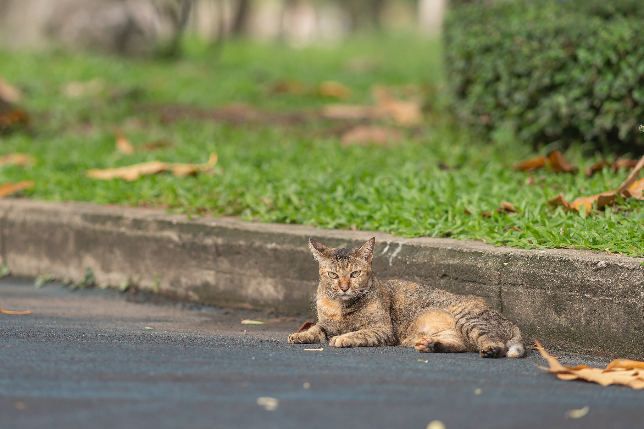 아스팔트 산책로에 누워있는 삼색 고양이