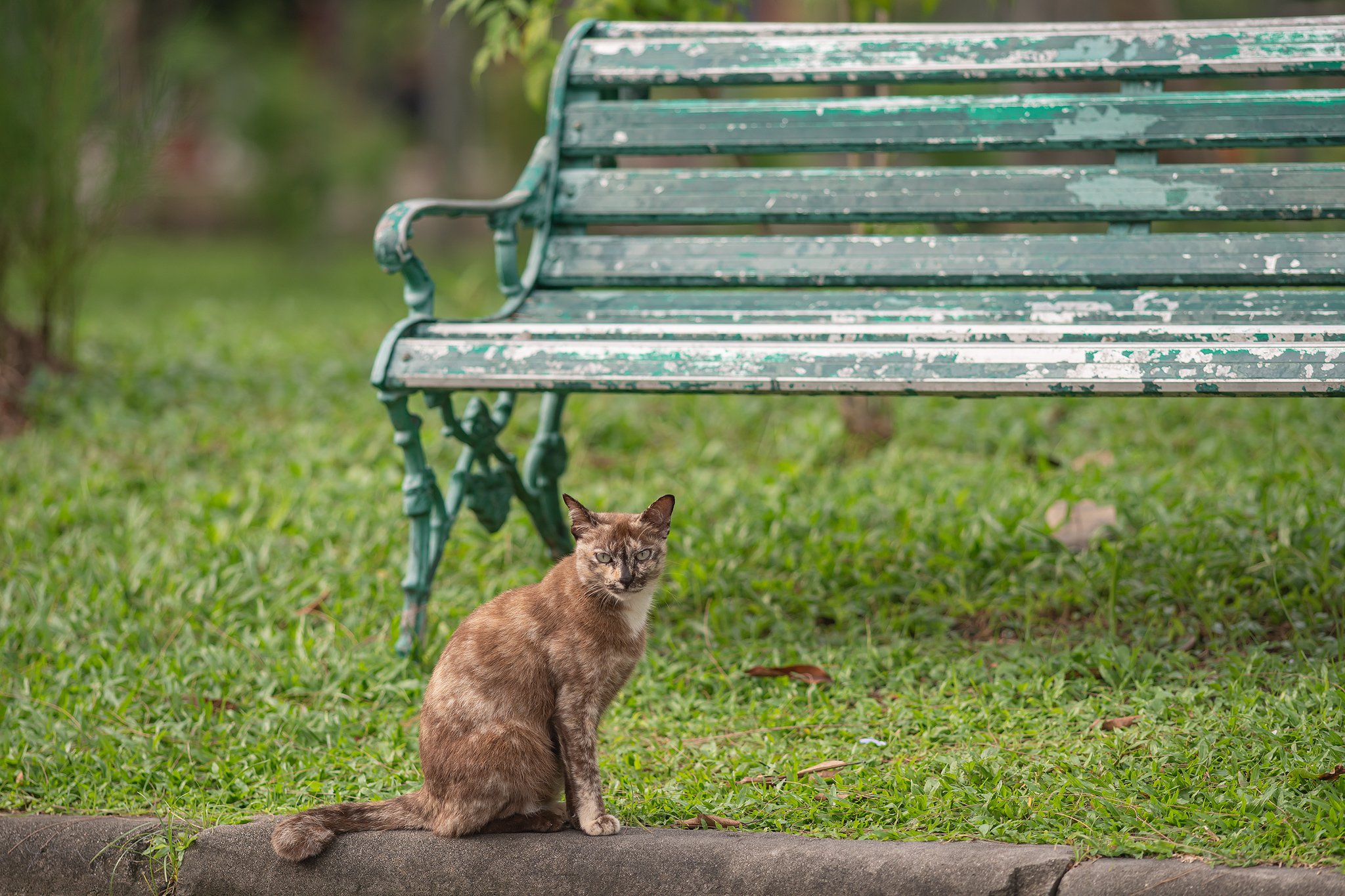 강렬한 인상의 벤치아래 고양이