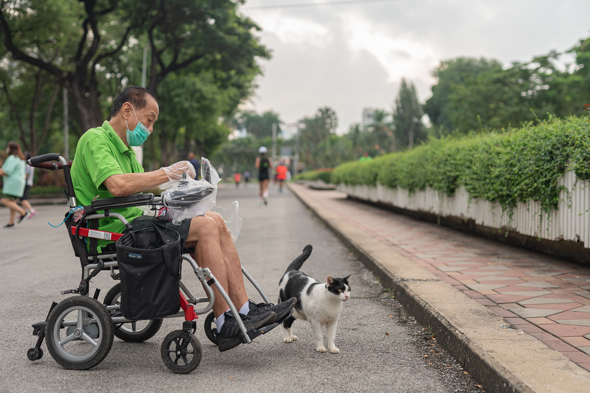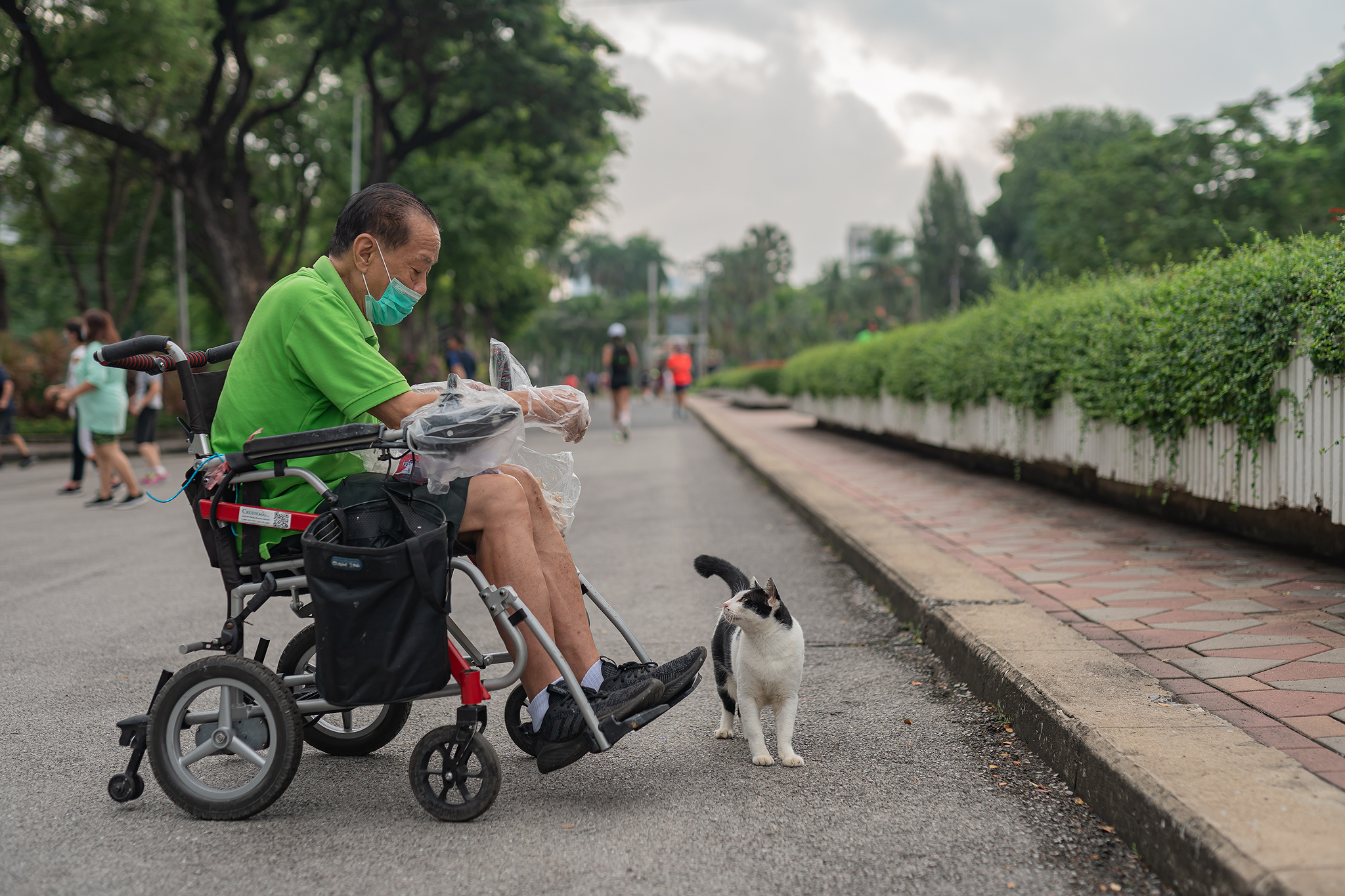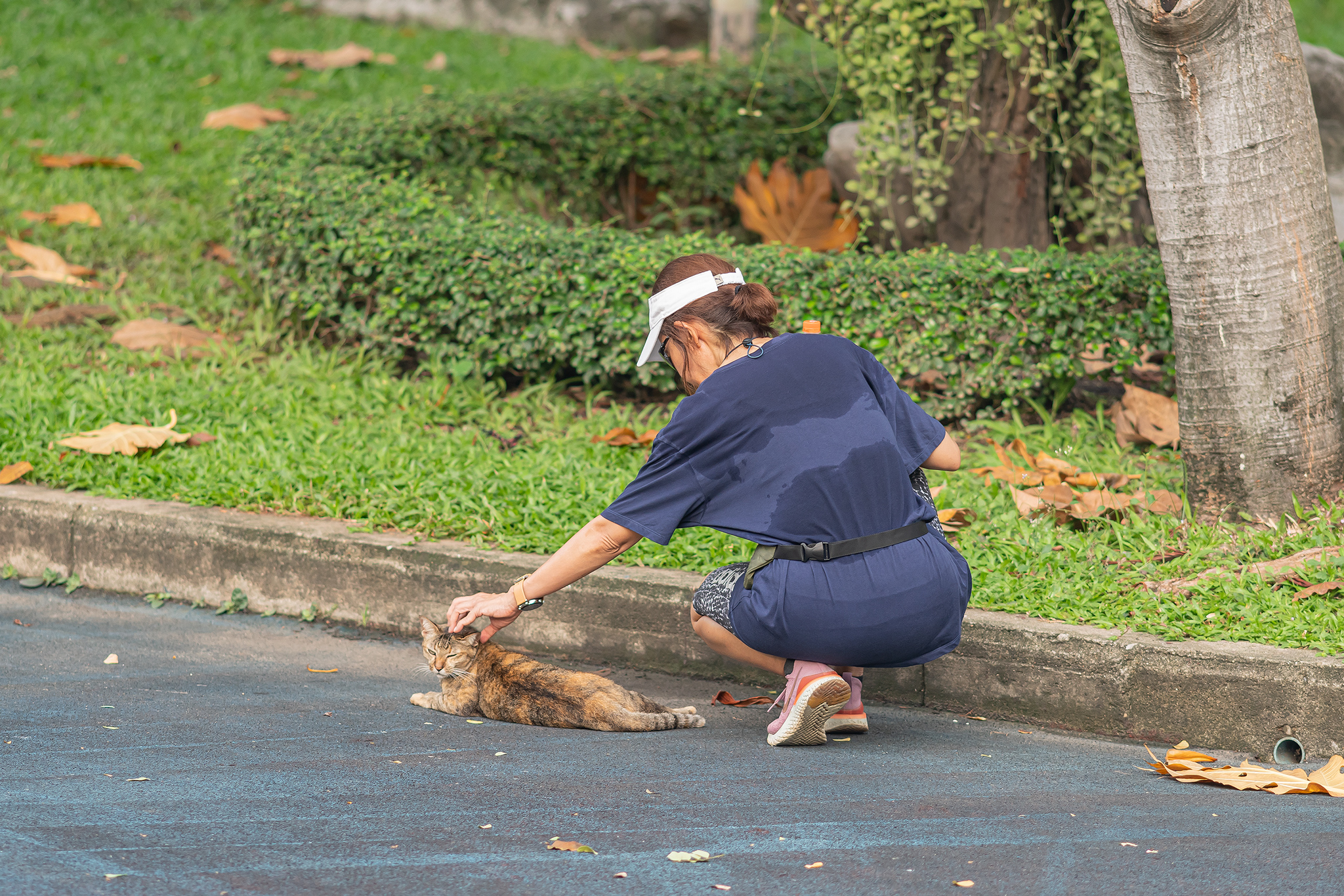 태국의 시민이 조깅하다 이쁜 고양이를 발견하고 살짝 머리를 쓰다 듬어 줍니다.