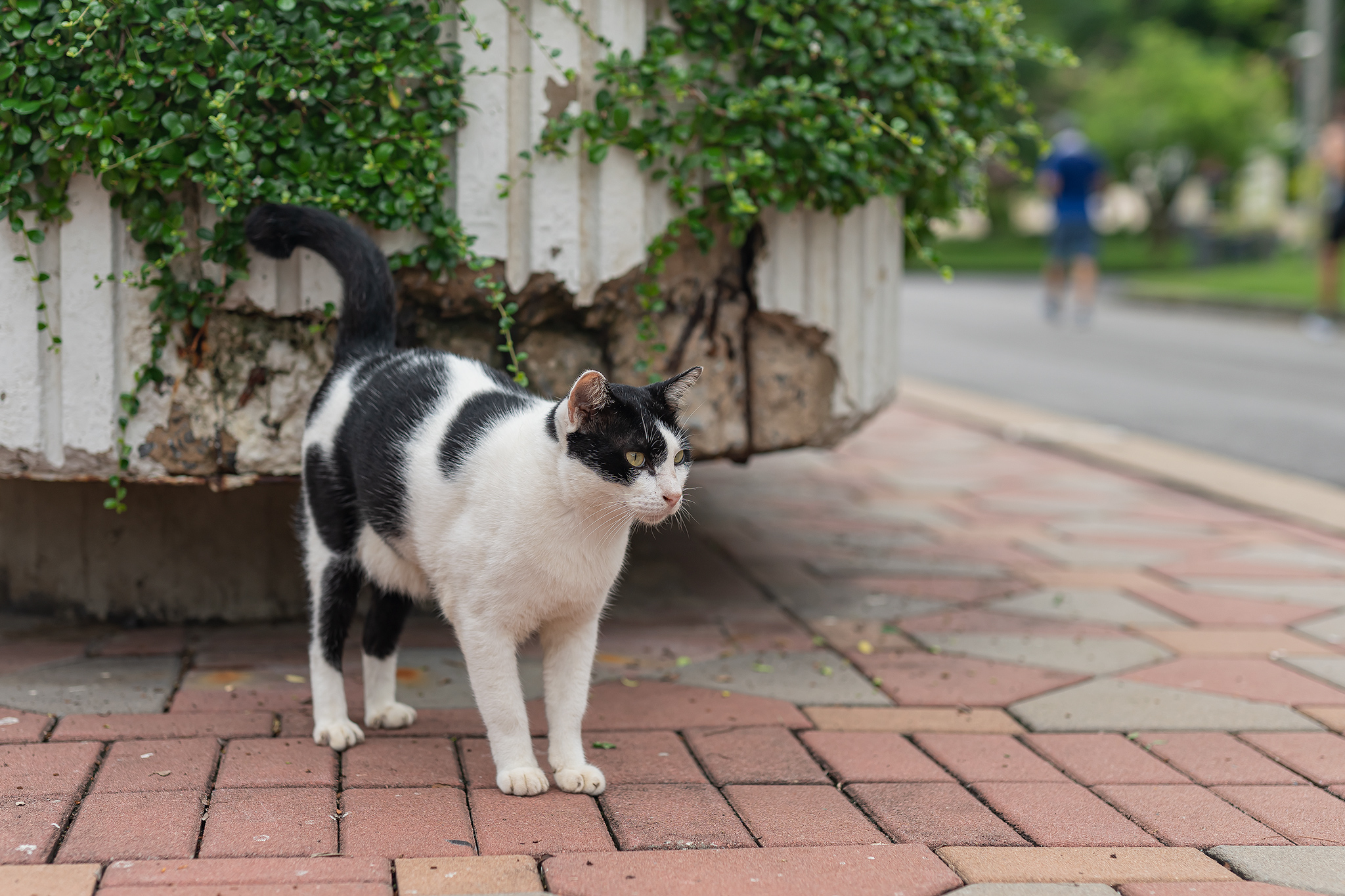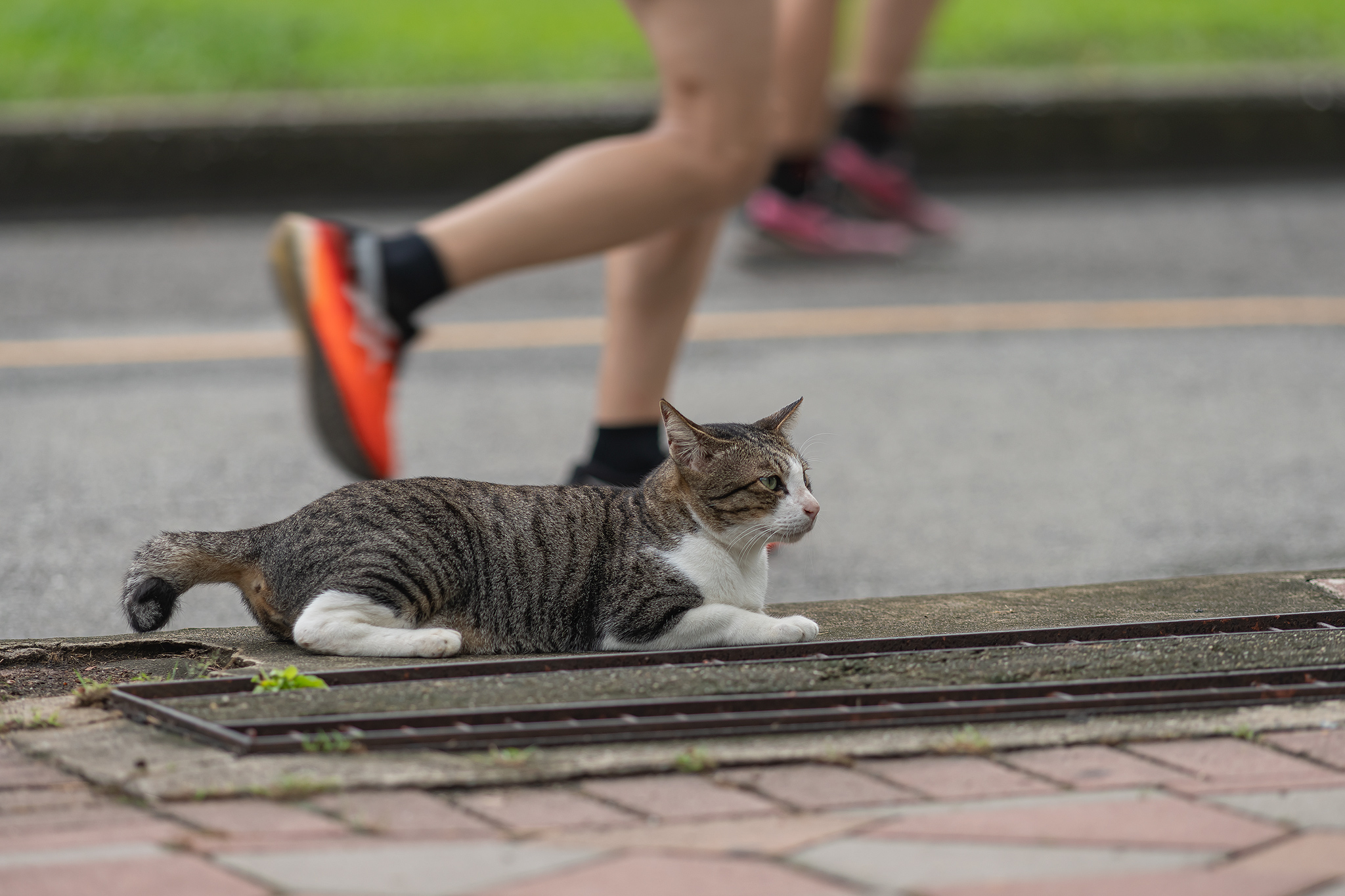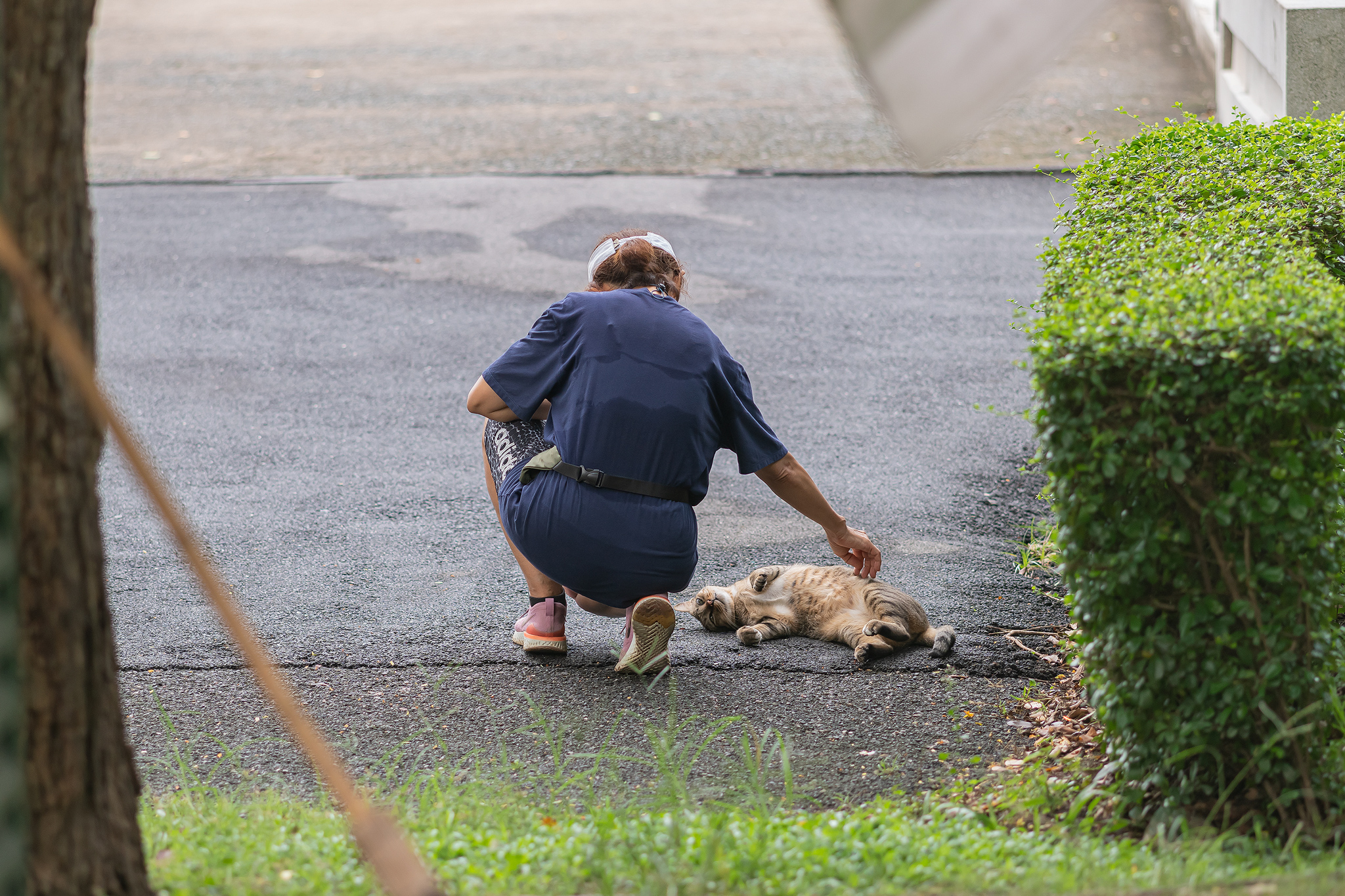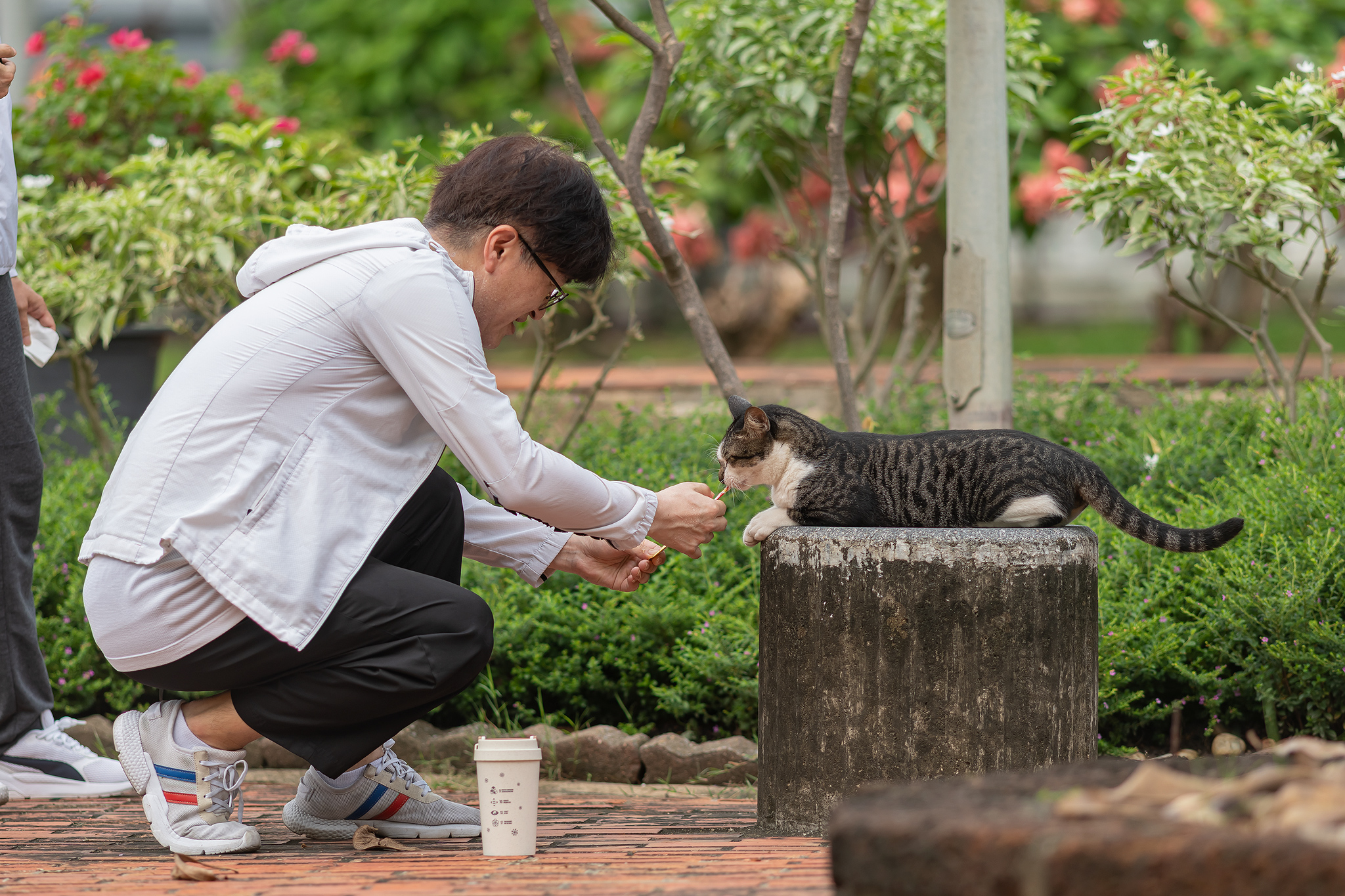 태국의 시민이 조깅하다 이쁜 고양이를 발견하고 살짝 머리를 쓰다 듬어 줍니다.