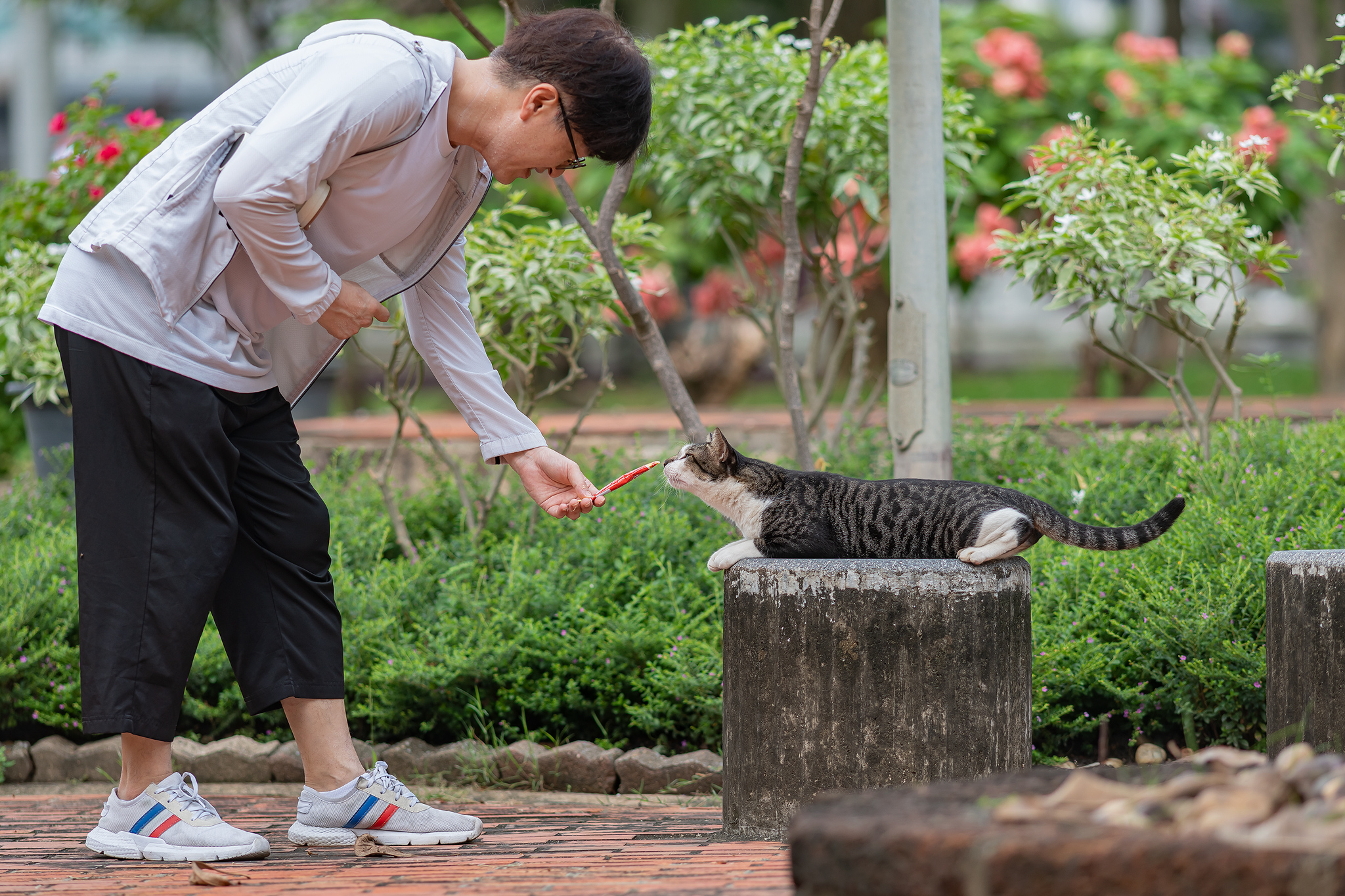 친절한 시민이 고등어 고양이에게 츄르를 나눠 줍니다.