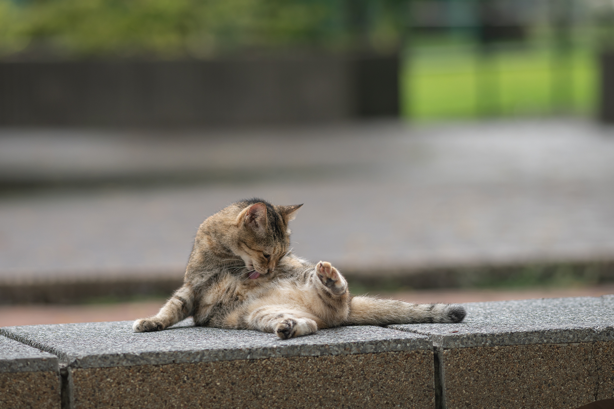 돌담위의 그루밍하는 고양이