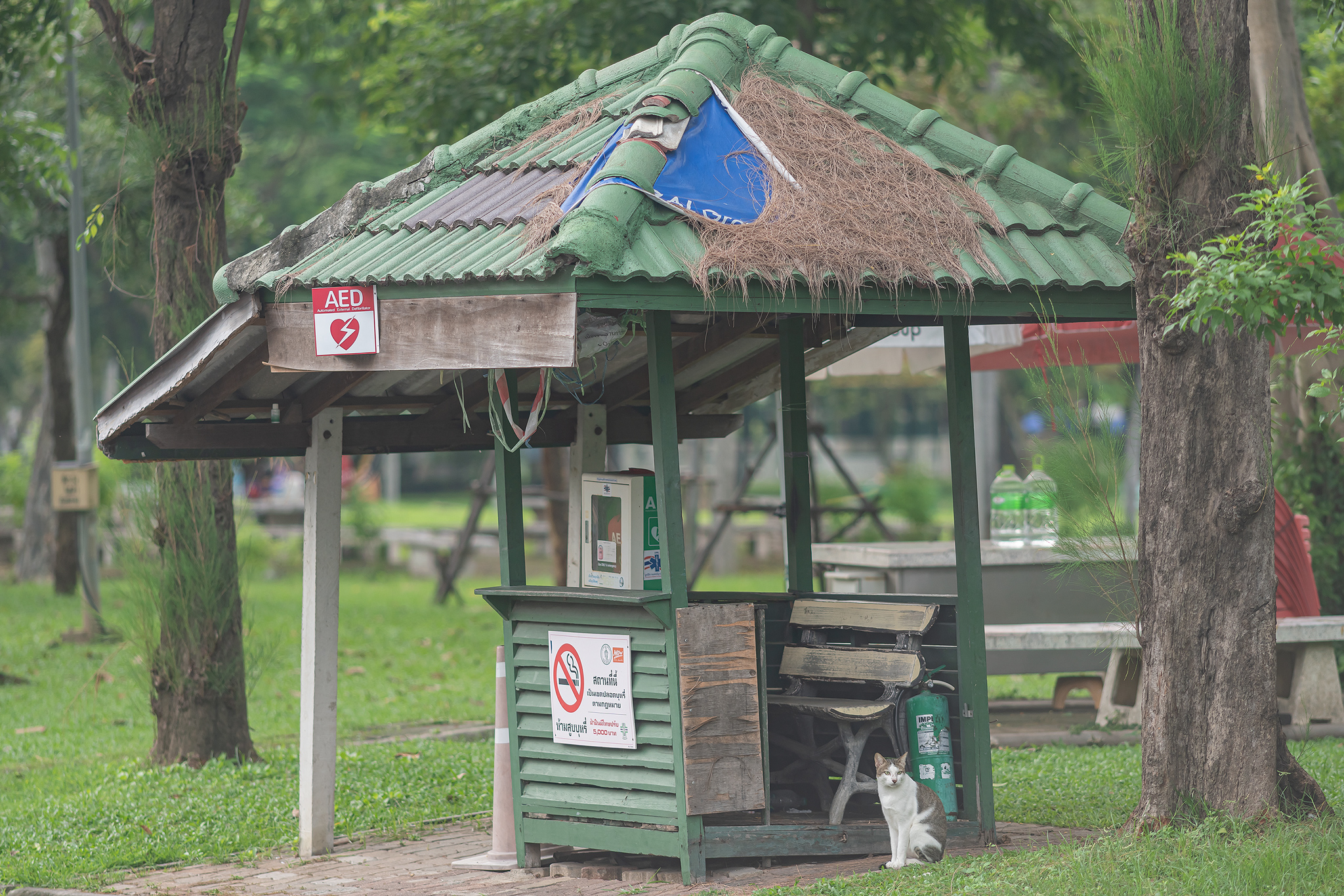 공원 쉼터에서 누워있는 고등어 고양이
