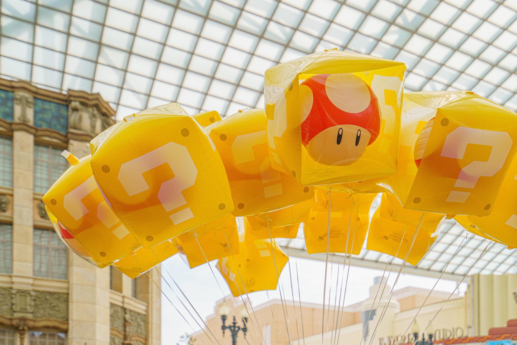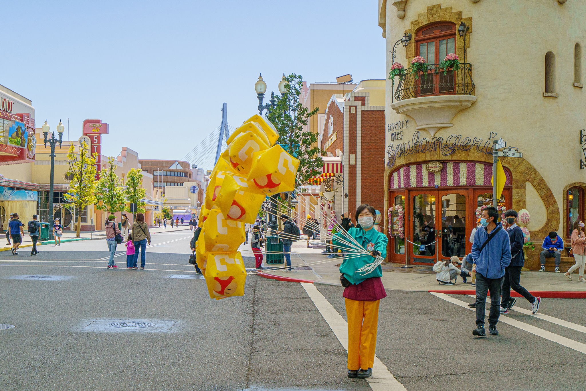 USJ 메인 거리에서 물음표 풍선을 판매하며 슈퍼 닌텐도 월드의 홍보를 하고 있습니다.