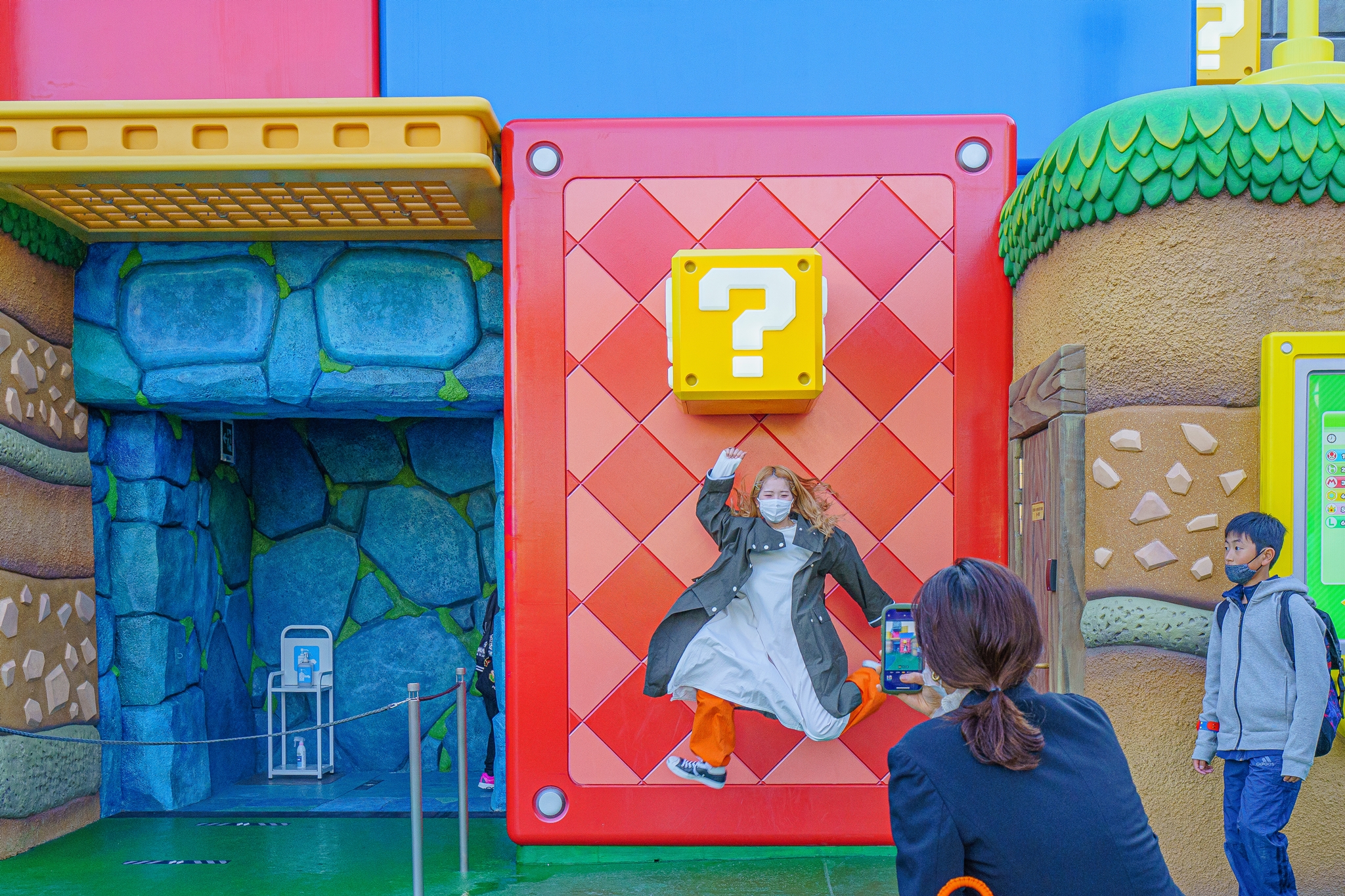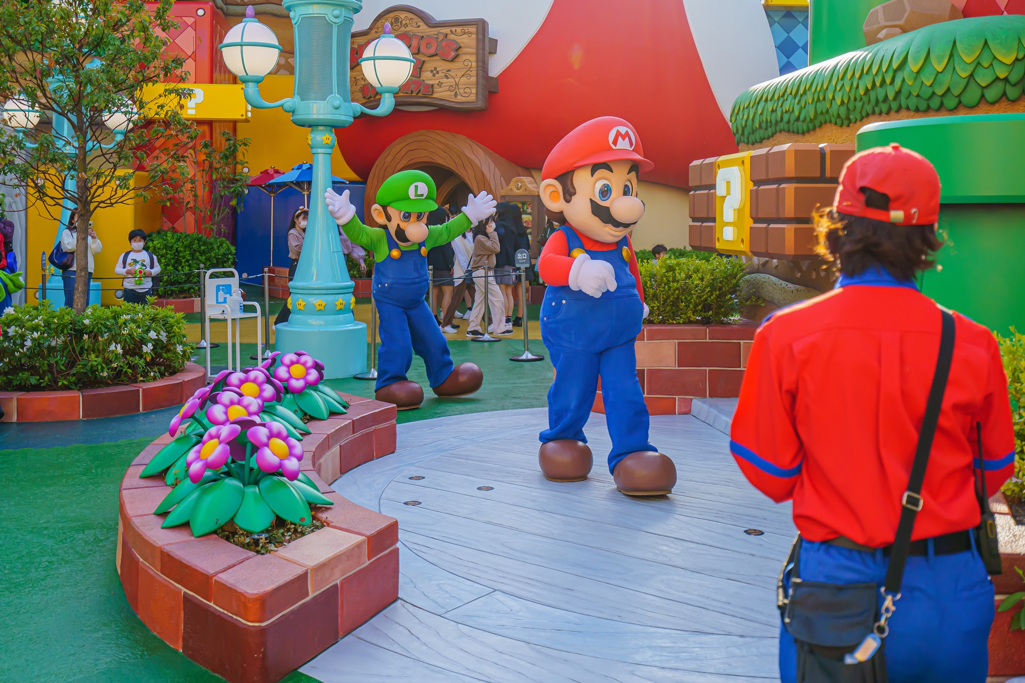 USJ 메인 거리에서 물음표 풍선을 판매하며 슈퍼 닌텐도 월드의 홍보를 하고 있습니다.