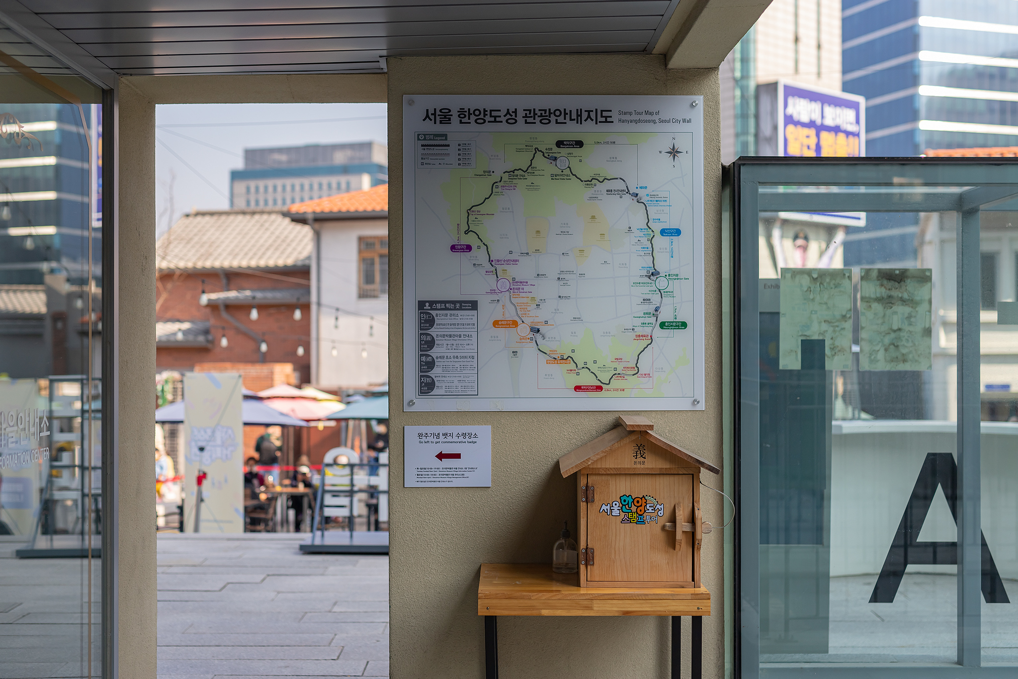 한양도성 관광안내지도와 한양도성 스탬프 투어의 도장이 있습니다.