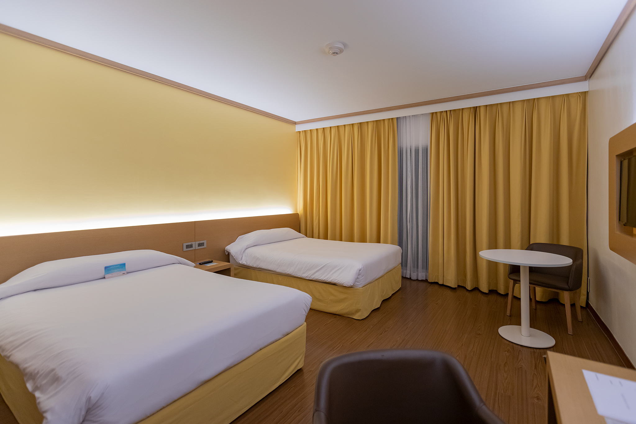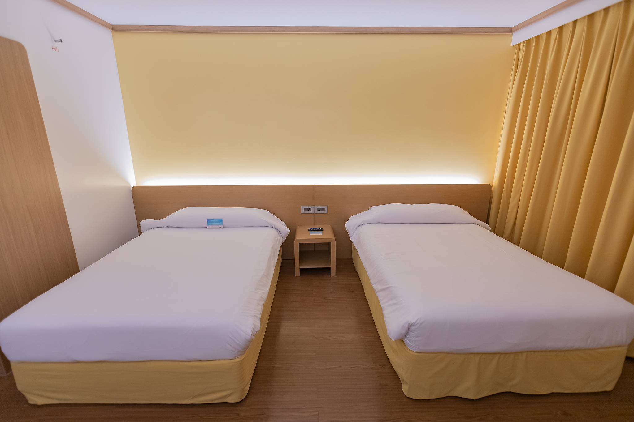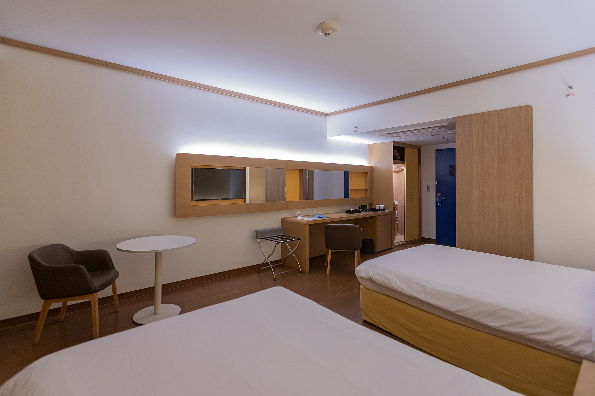넉넉한 크기의 침대 두개 가 놓여 있는 트윈룸