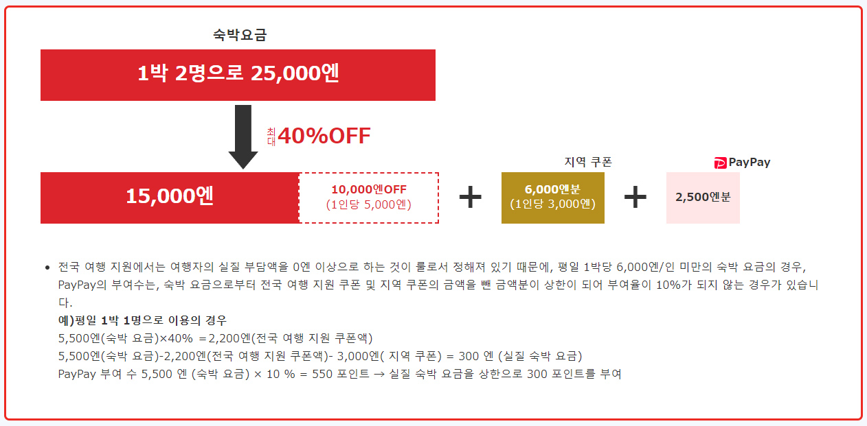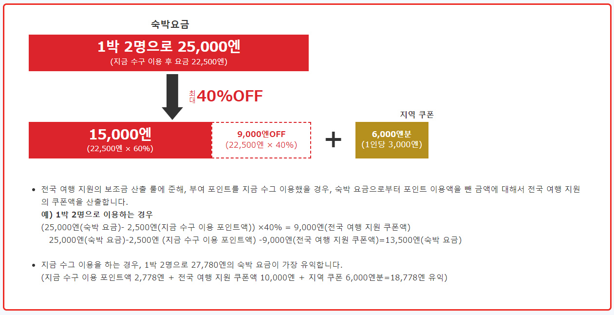 1인 1박 5,000엔 이상 숙박을 하게되면 숙박 요금의 40%를 할인해주며 1인 1박당 평일 3,000엔, 휴일 1,000엔의 현지에서 사용할 수 있는 쿠폰을 제공하게 됩니다.