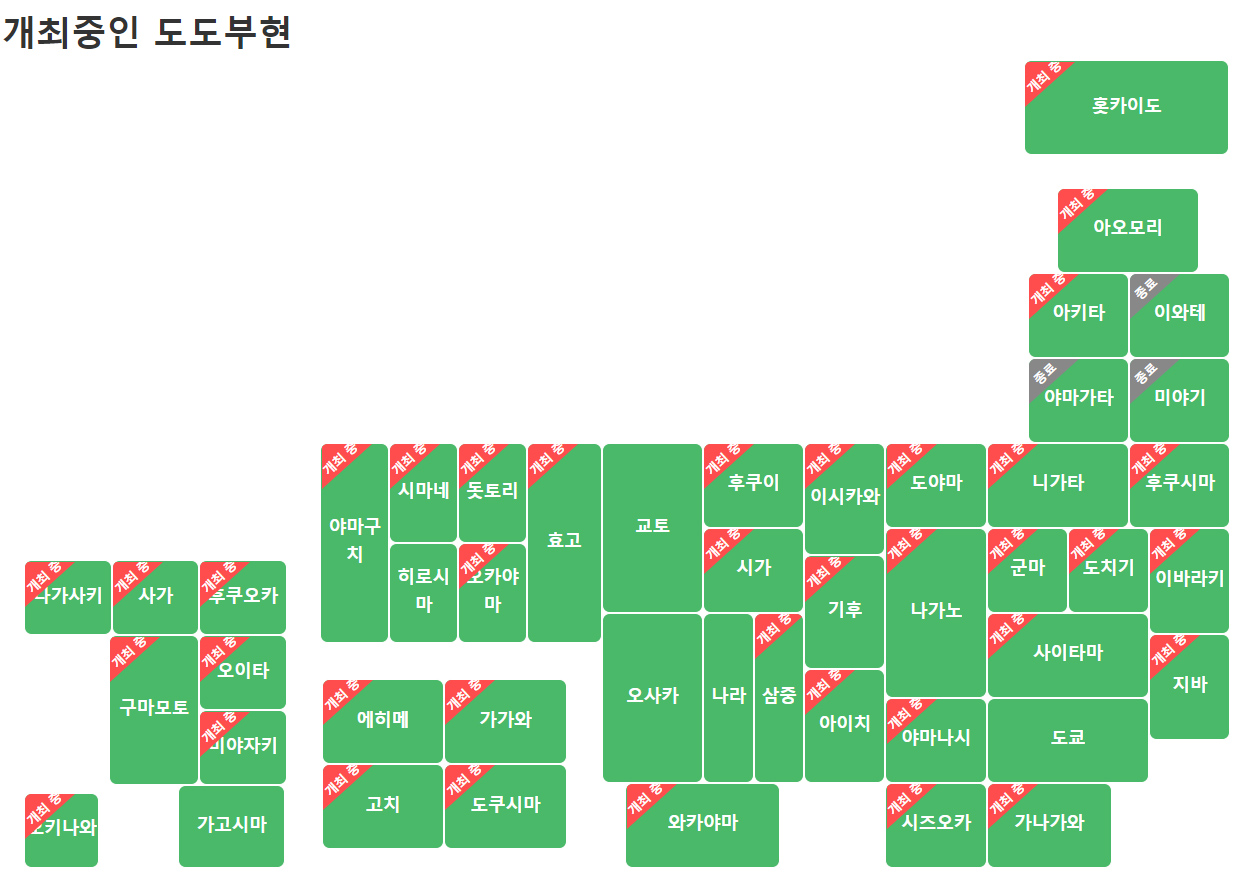 지금 거의 일본의 모든 지역에서 실시되고 있으며 일부는 종료, 도쿄, 교토, 오사카, 나라, 히로시마 지역은 참가자가 몰릴 것 같아 어느 정도 타 지역에서 예산을 소요하고 진행될 것 같습니다.