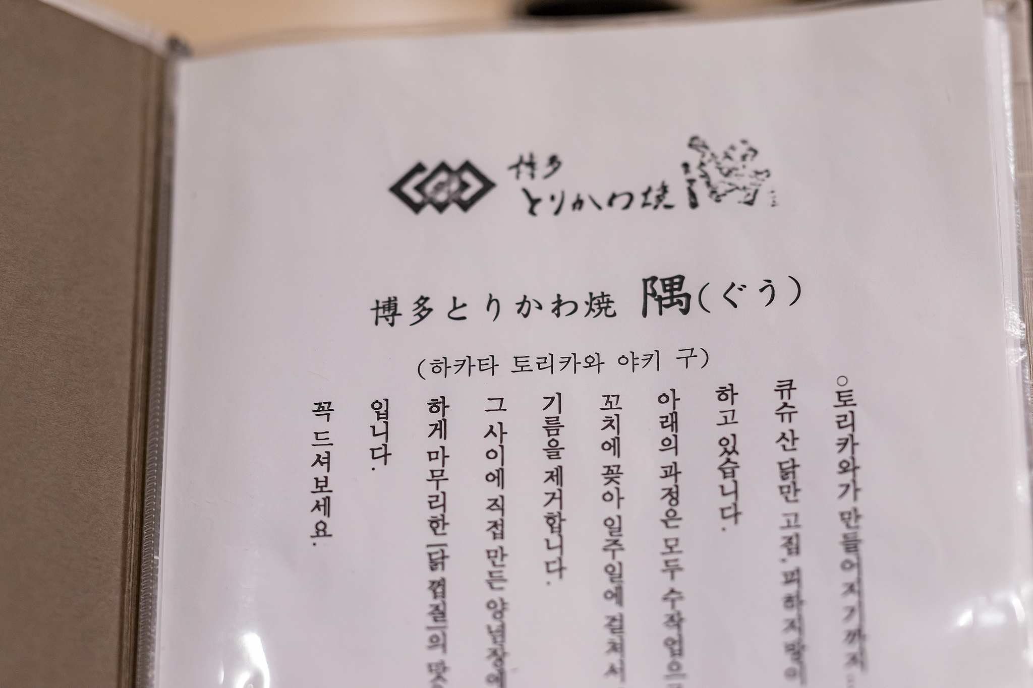 다른 일본 지역에도 닭껍질 만을 꼬치에 끼워 구워먹는 도리카와를 먹을 수 있는데 후쿠오카에서는 닭껍질을 꼬치에 돌돌말아 바짝 구워낸 이곳만의 도리카와를 맛볼 수 있습니다.