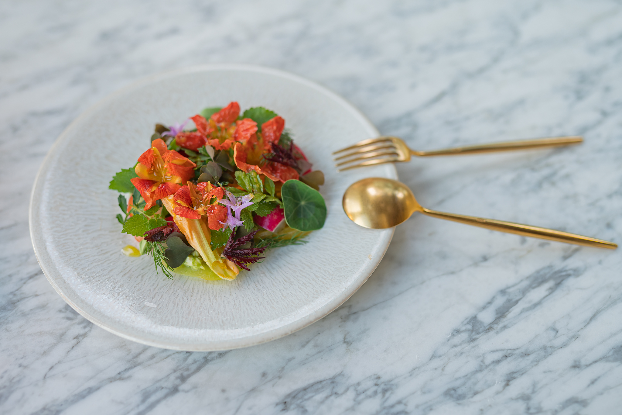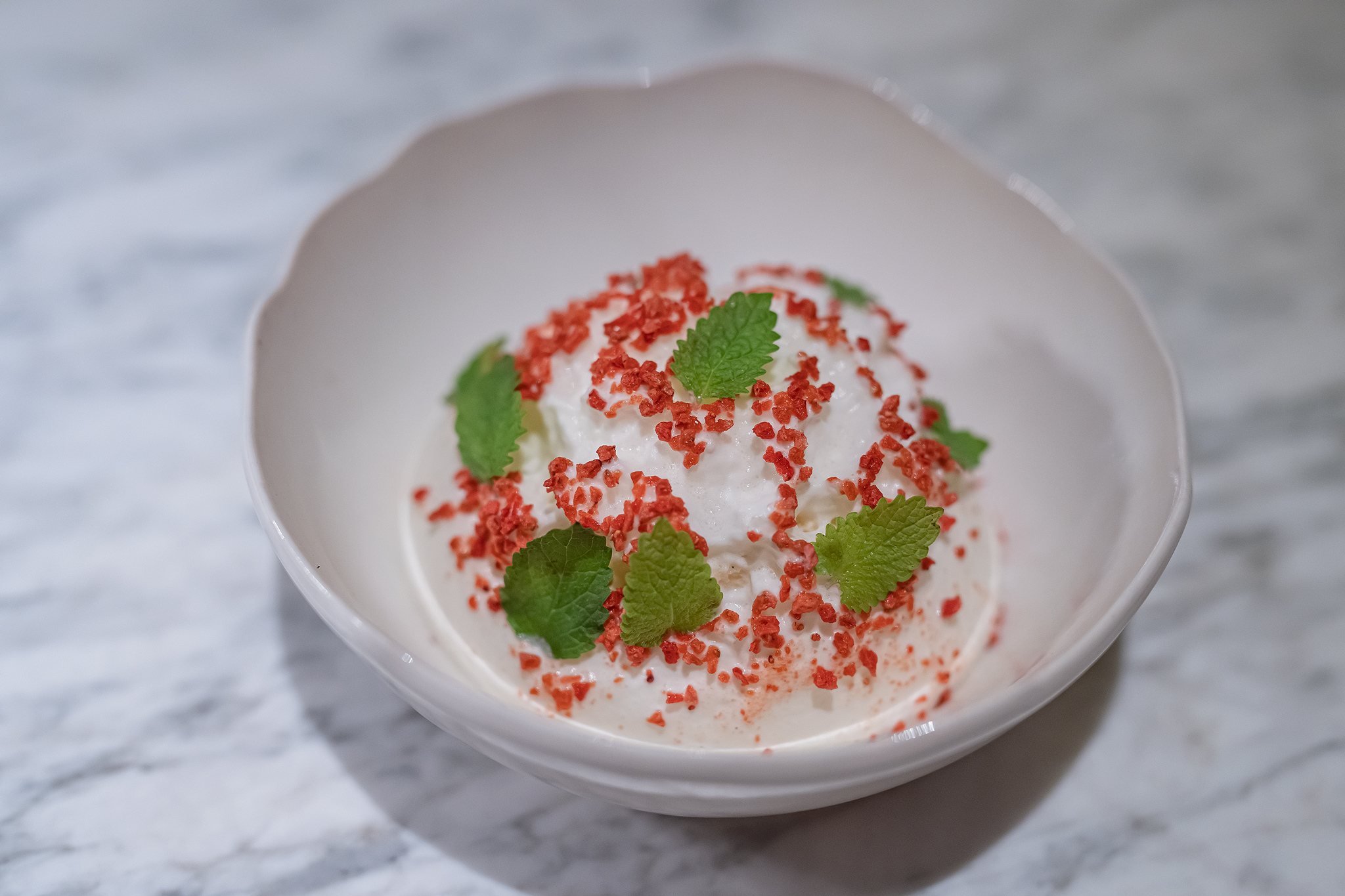 엘더 플로워 리퀴르와 구아바 폼 속에 스폰지 케이크가 숨어 있으며 라즈베리 파우더를 뿌렸습니다.