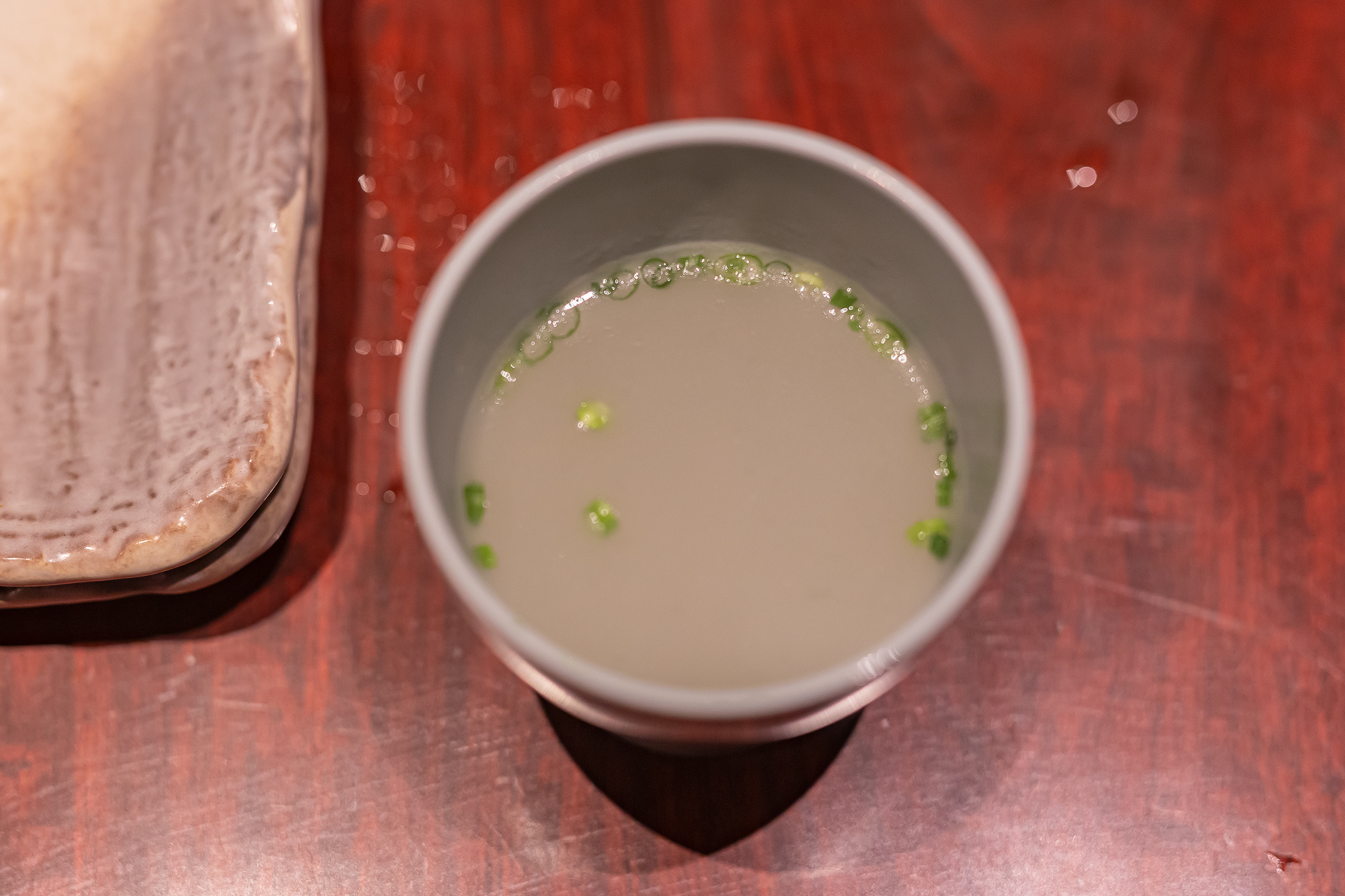 후쿠오카의 야키토리 가게에서는 다 먹었다고 하면 이렇게 따뜻한 닭 육수를 가져다 줍니다.