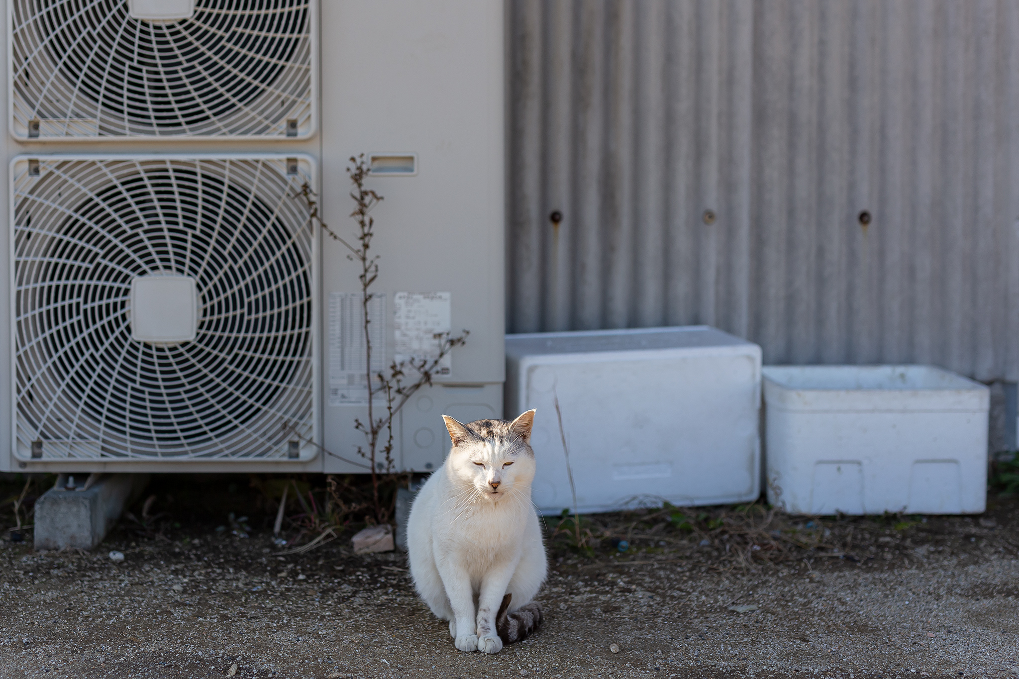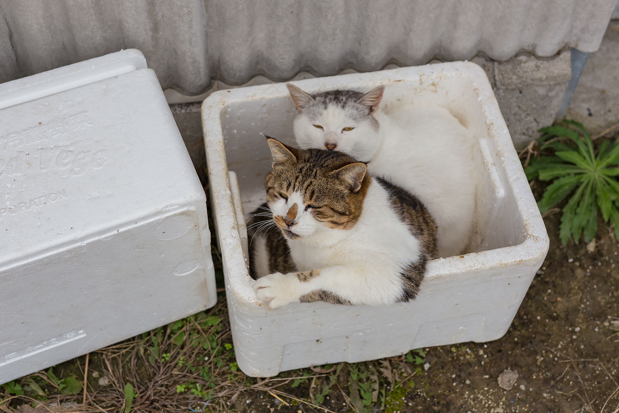 길 고양이들이 스티로폼 박스 안에서 좋은 시간을 보내고 있었던 기타큐슈의 작은 항구마을