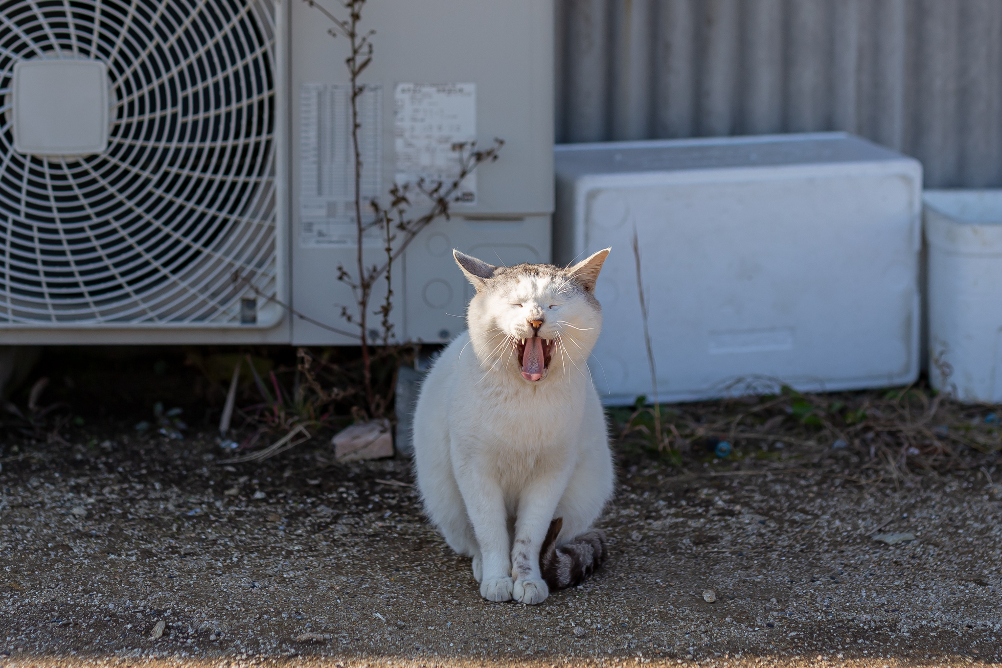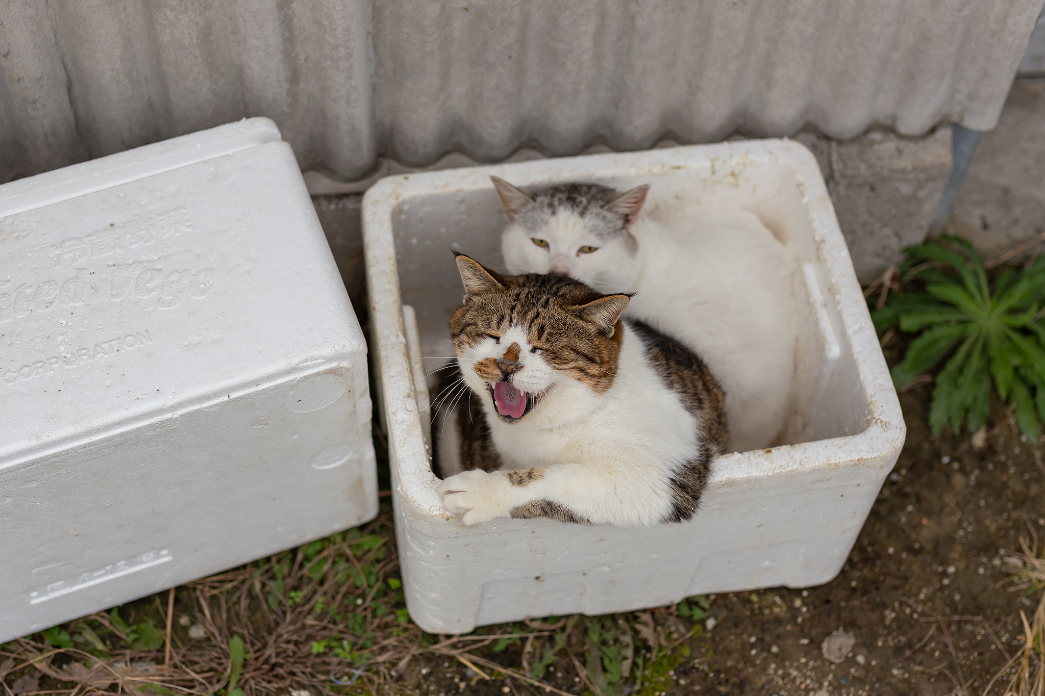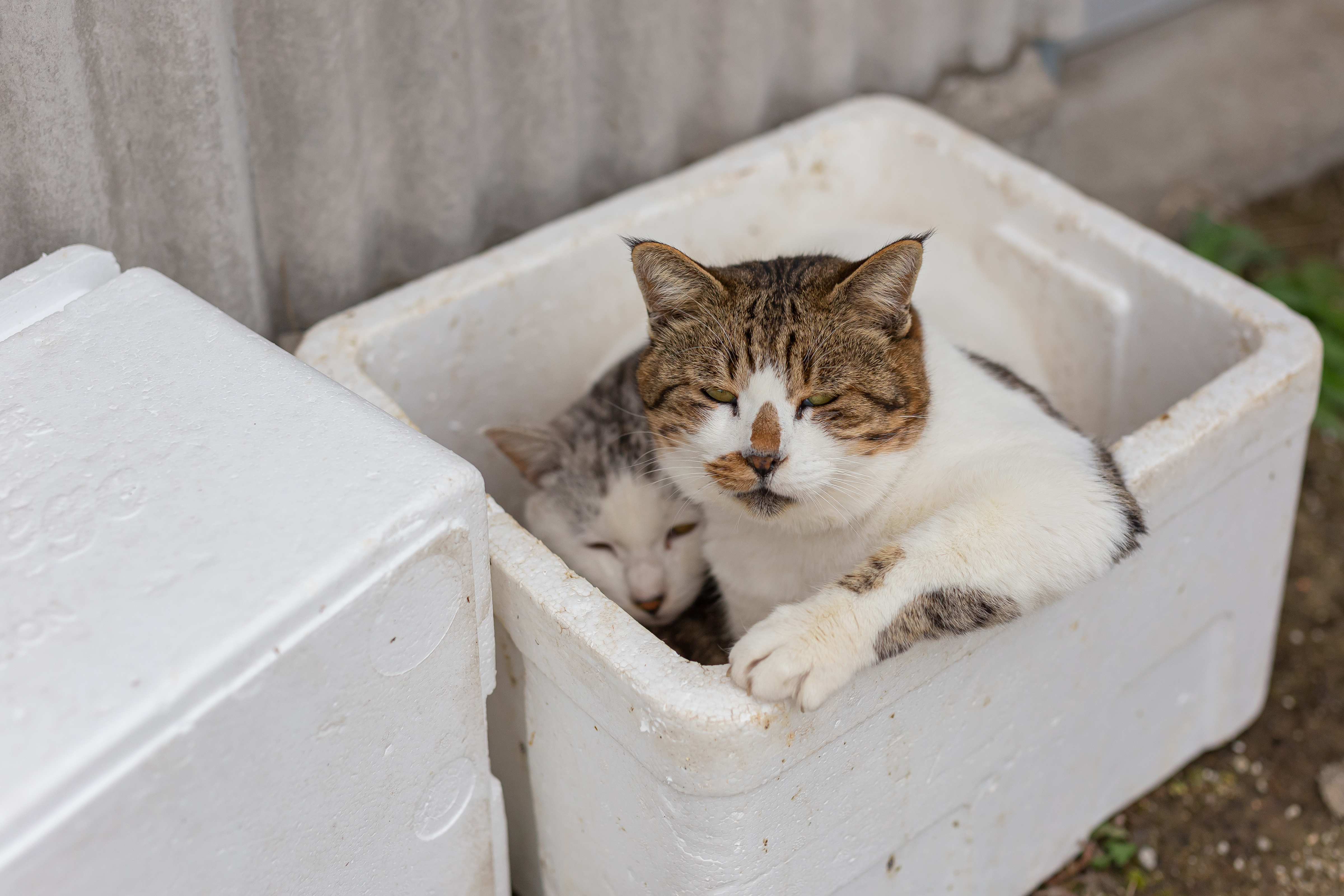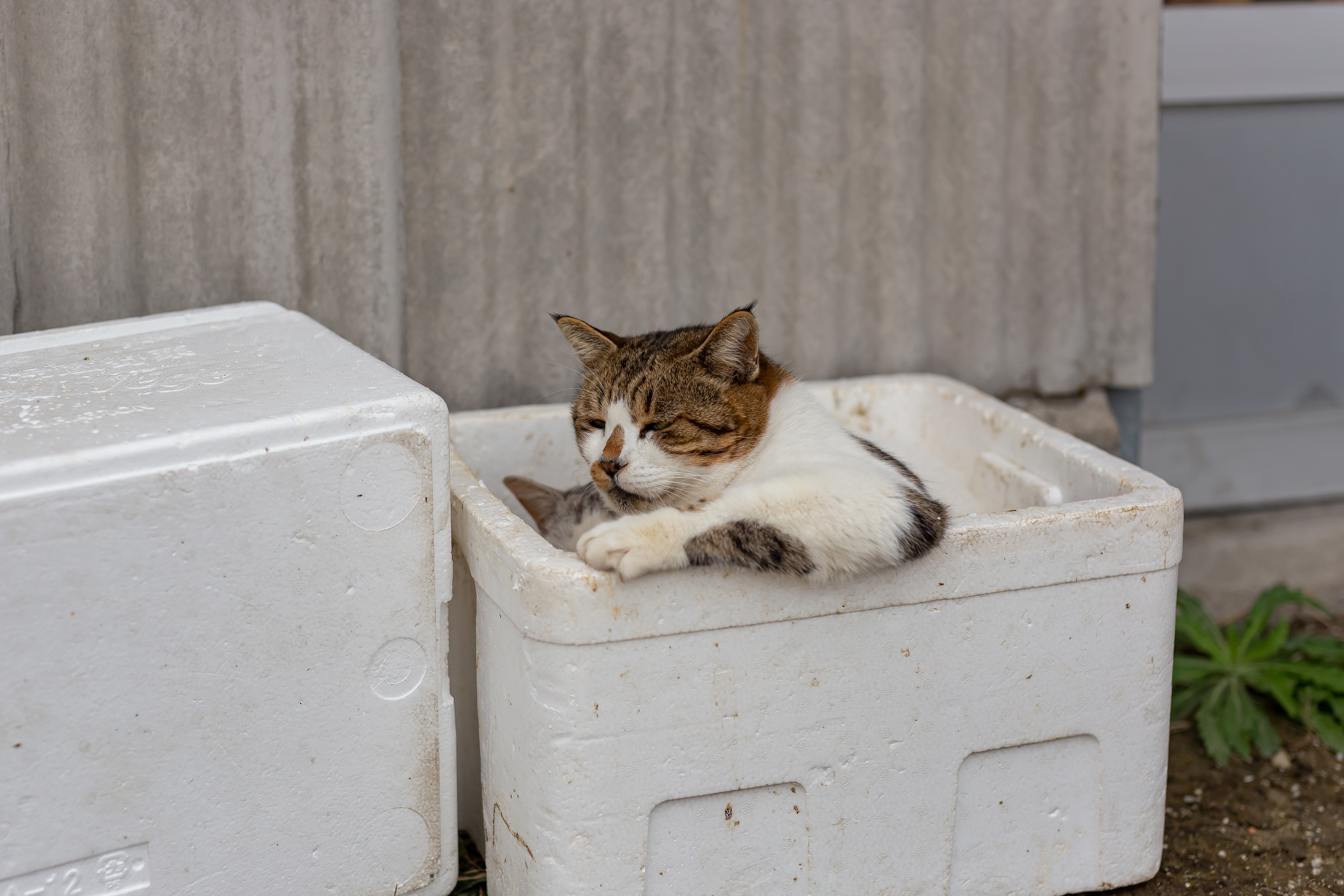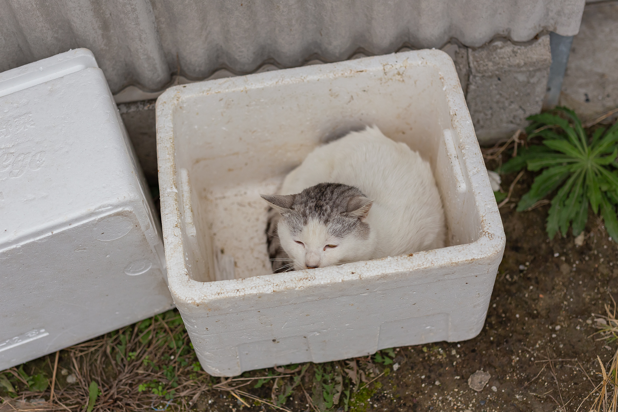 길 고양이들이 스티로폼 박스 안에서 좋은 시간을 보내고 있었던 기타큐슈의 작은 항구마을