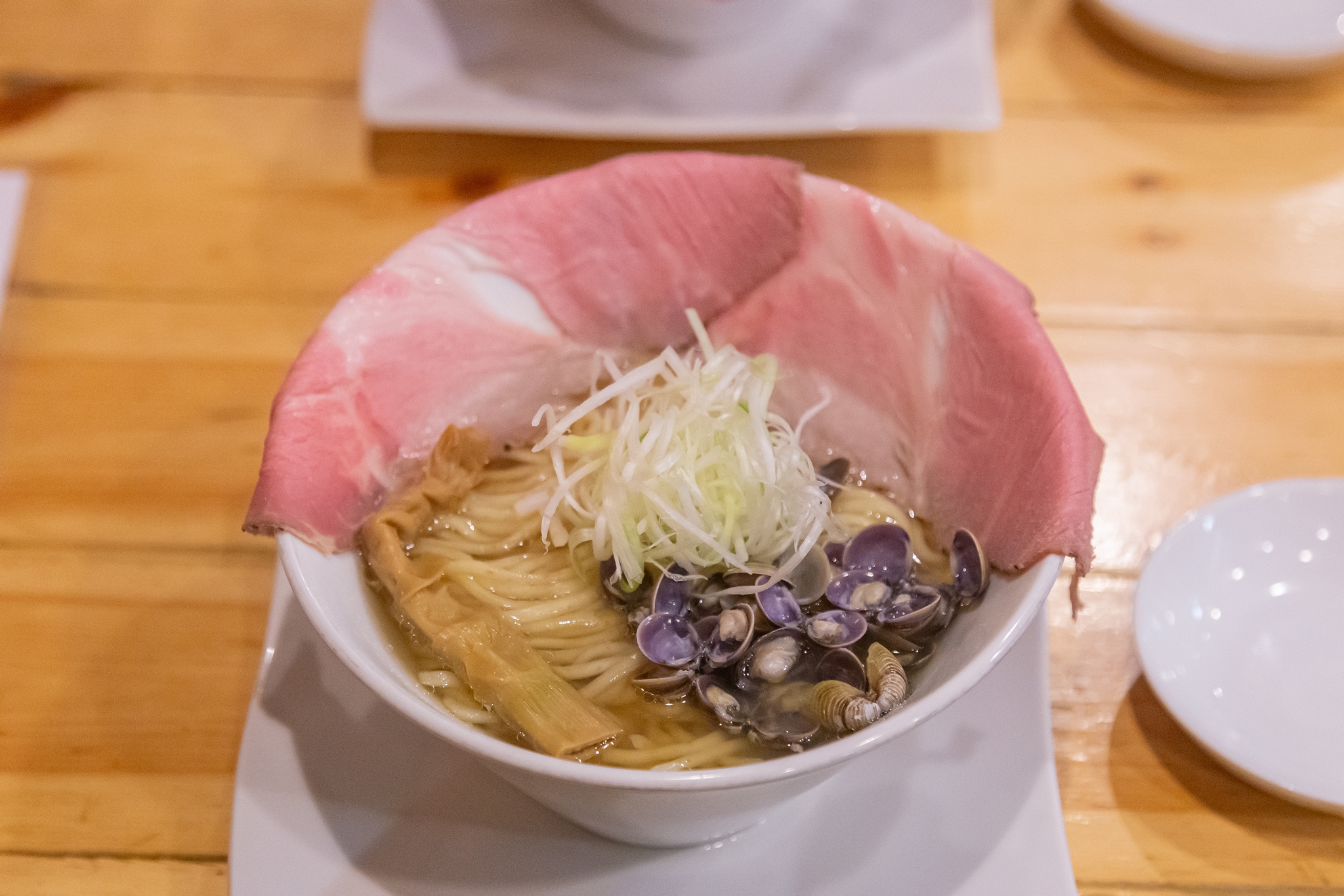 간장 육수에 대합, 바지락, 재첩 조개 등을 넣어 시원하고 감칠맛 가득한 육수가 일품이며 메뉴에 따라 들어있는 조개가 다릅니다. 메뉴는 시지미라멘(しじみラーメン, 재첩), 아사리라멘(あさりラーメン, 바지락), 하마구리라멘(はまぐりラーメン, 대합) 세 종류입니다. 길쭉한 멘마가 토핑으로 들어가 있으며 반숙양념계란인 니타마고(煮玉子), 수비드로 약하게 조리한 얇은 돼지고기 레어챠슈(レアチャーシュー)를 토핑으로 같이 먹으면 더욱 맛있습니다.