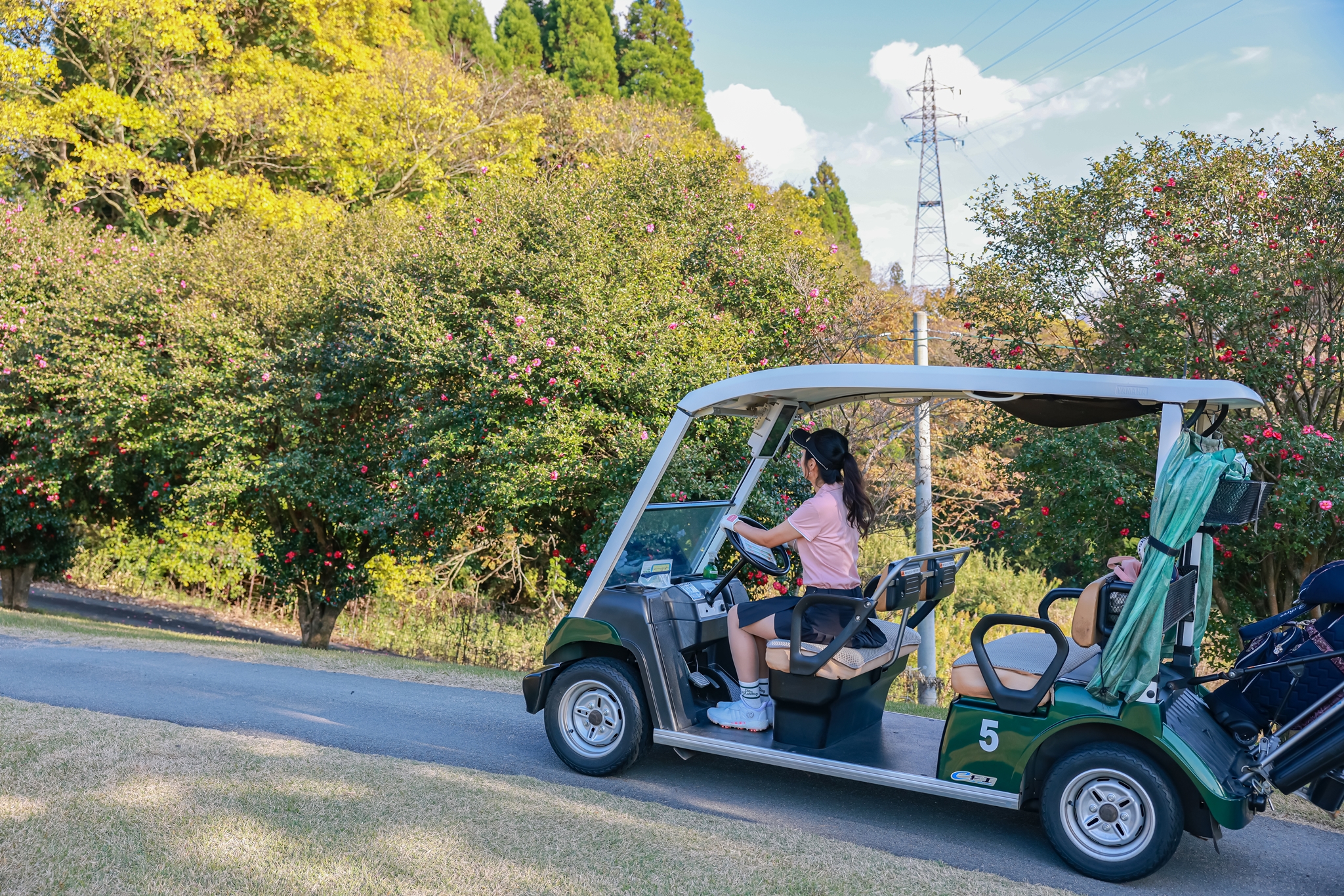 카트를 타고 이동하는 길도 이쁩니다. 동백꽃이 벌써 피어 있었습니다.